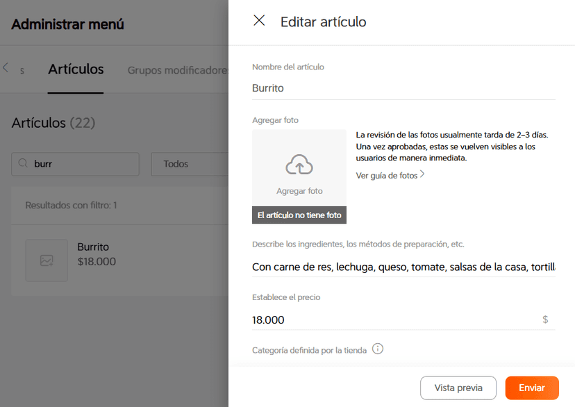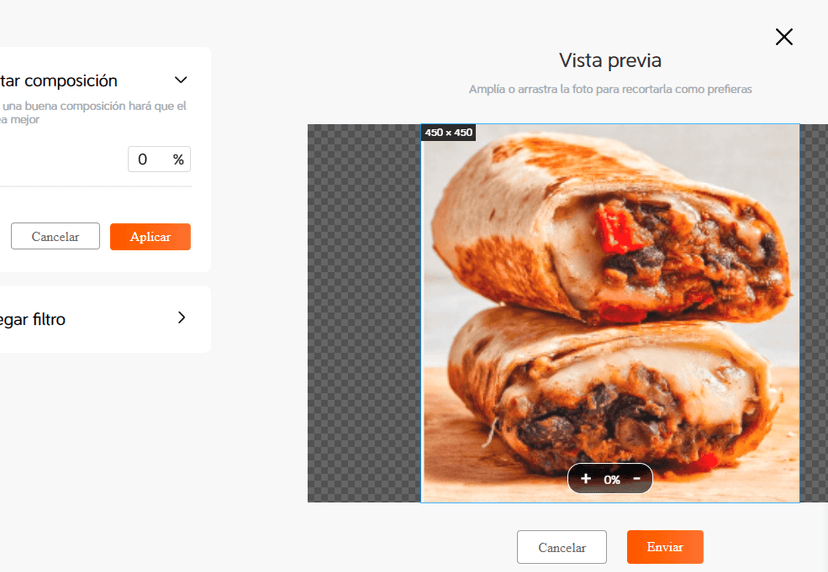 Si agregas una fotografía nueva, podrás ajustarla antes de agregarla a tu menú.