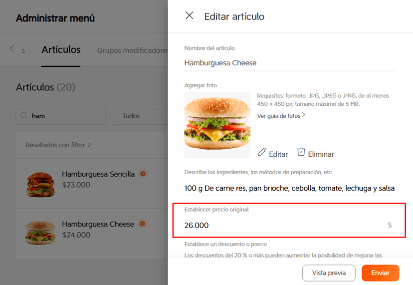 Una vez que hayas seleccionado enviar, el producto aparecerá en tu menú con el precio modificado.