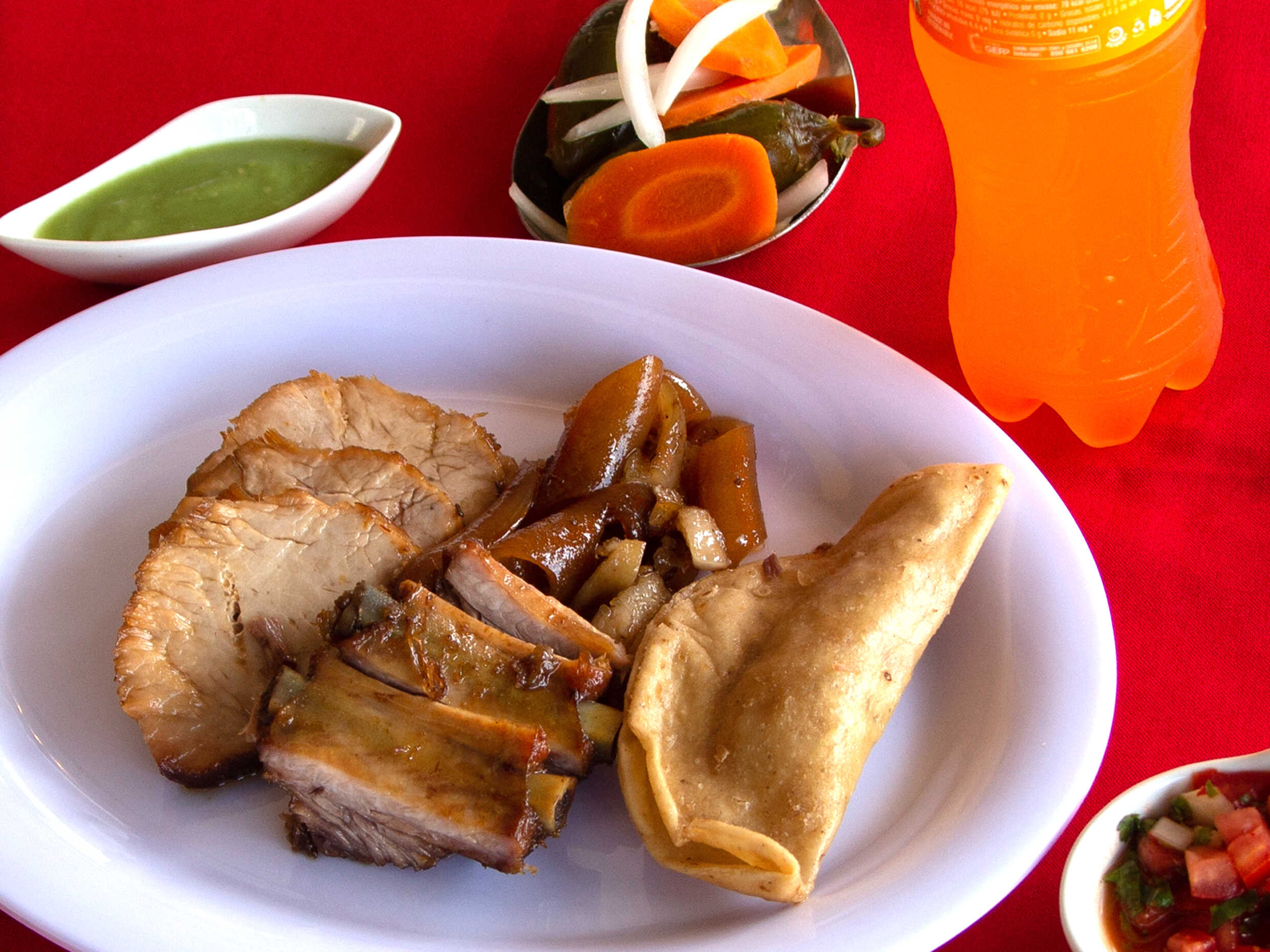 1/2 Kg de carnitas, 2 tacos dorados o chicharrón, 2 refrescos 355ml, tortillas, salsas y chiles.