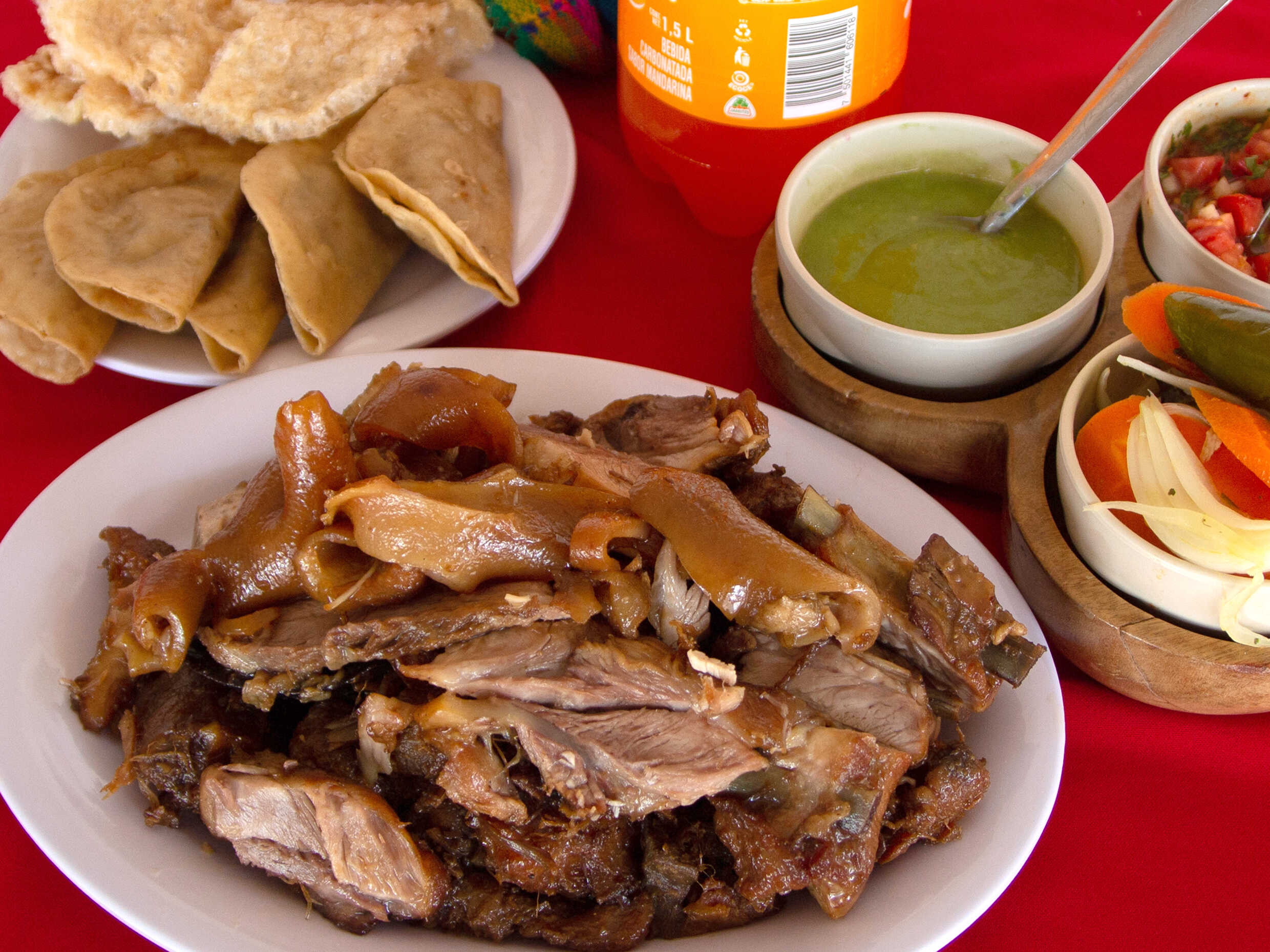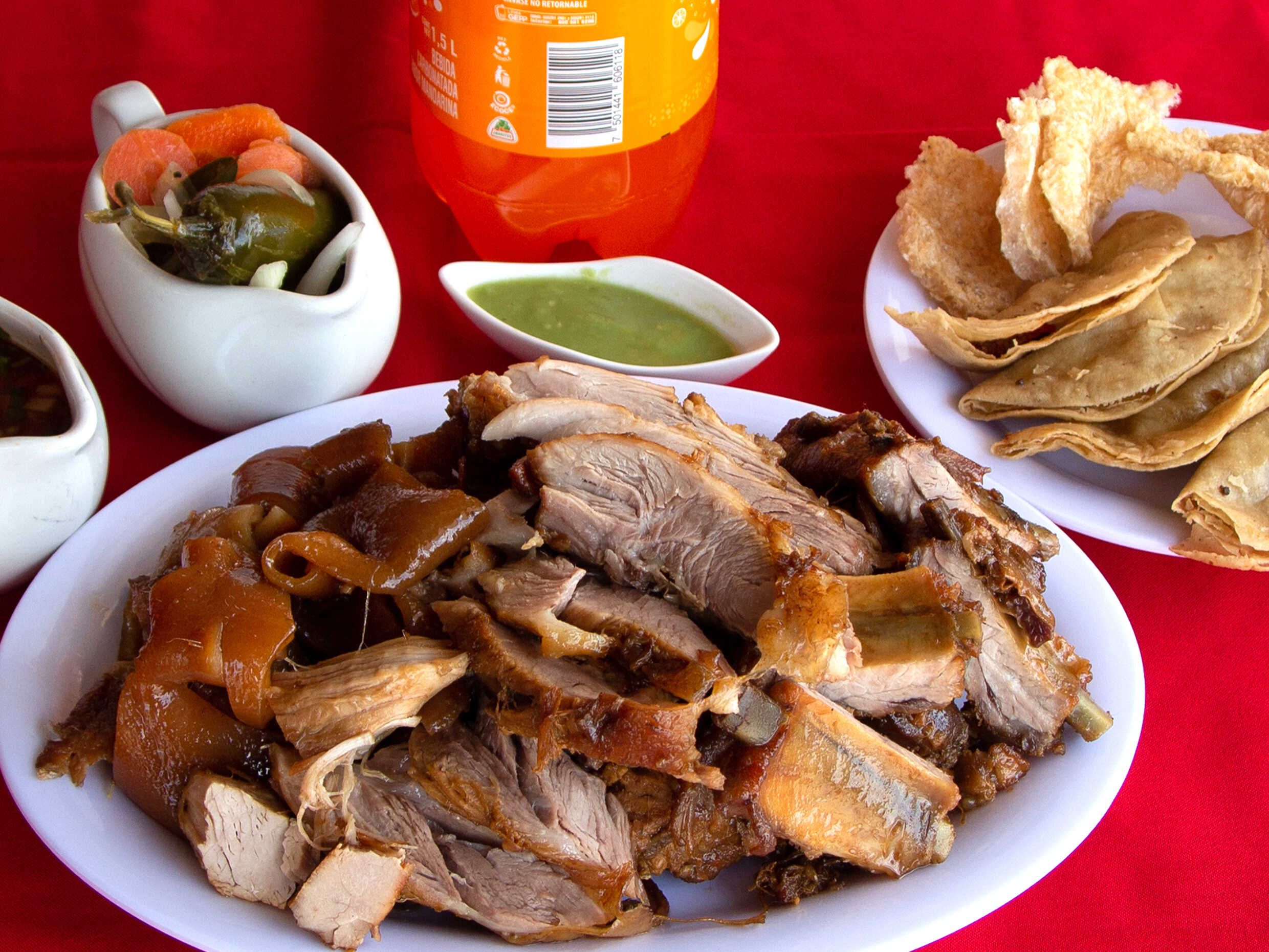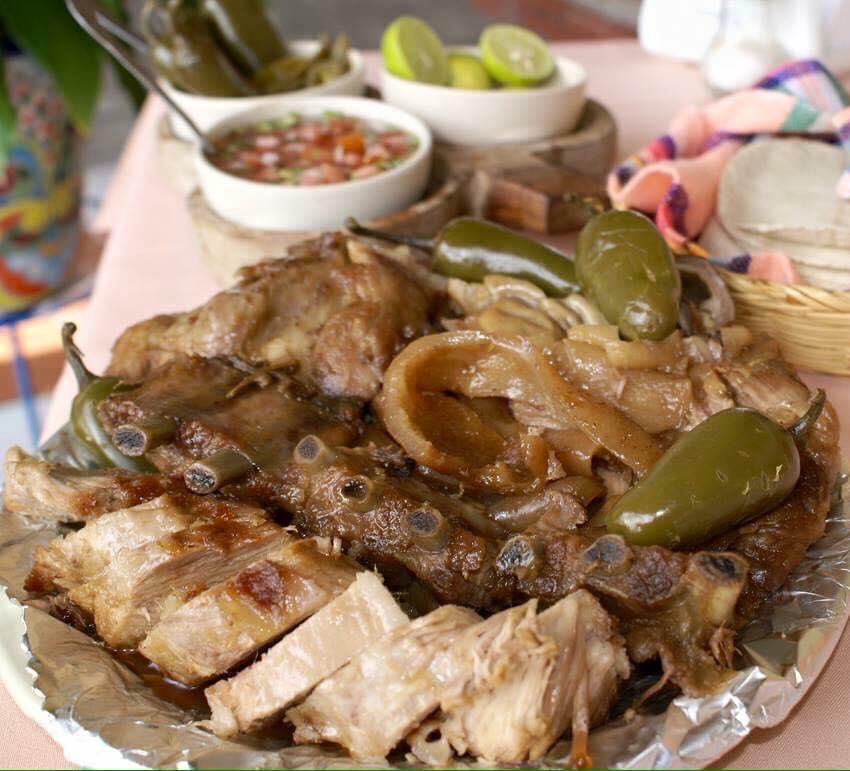 1 1/2 Kg de carnitas, 2 refrescos de 1.5 lt., 8 tacos dorados o chicharrón, tortillas, chiles y salsa