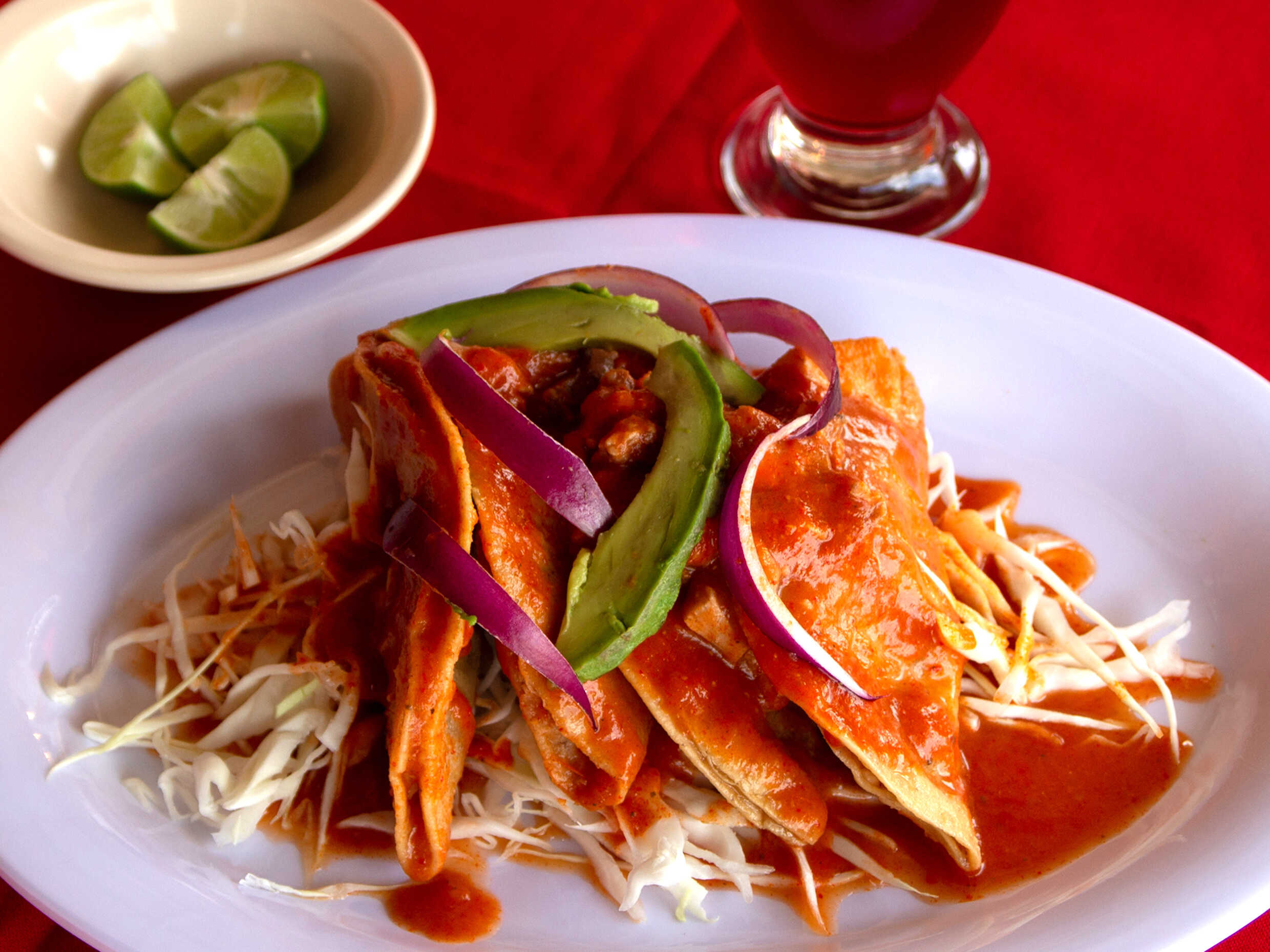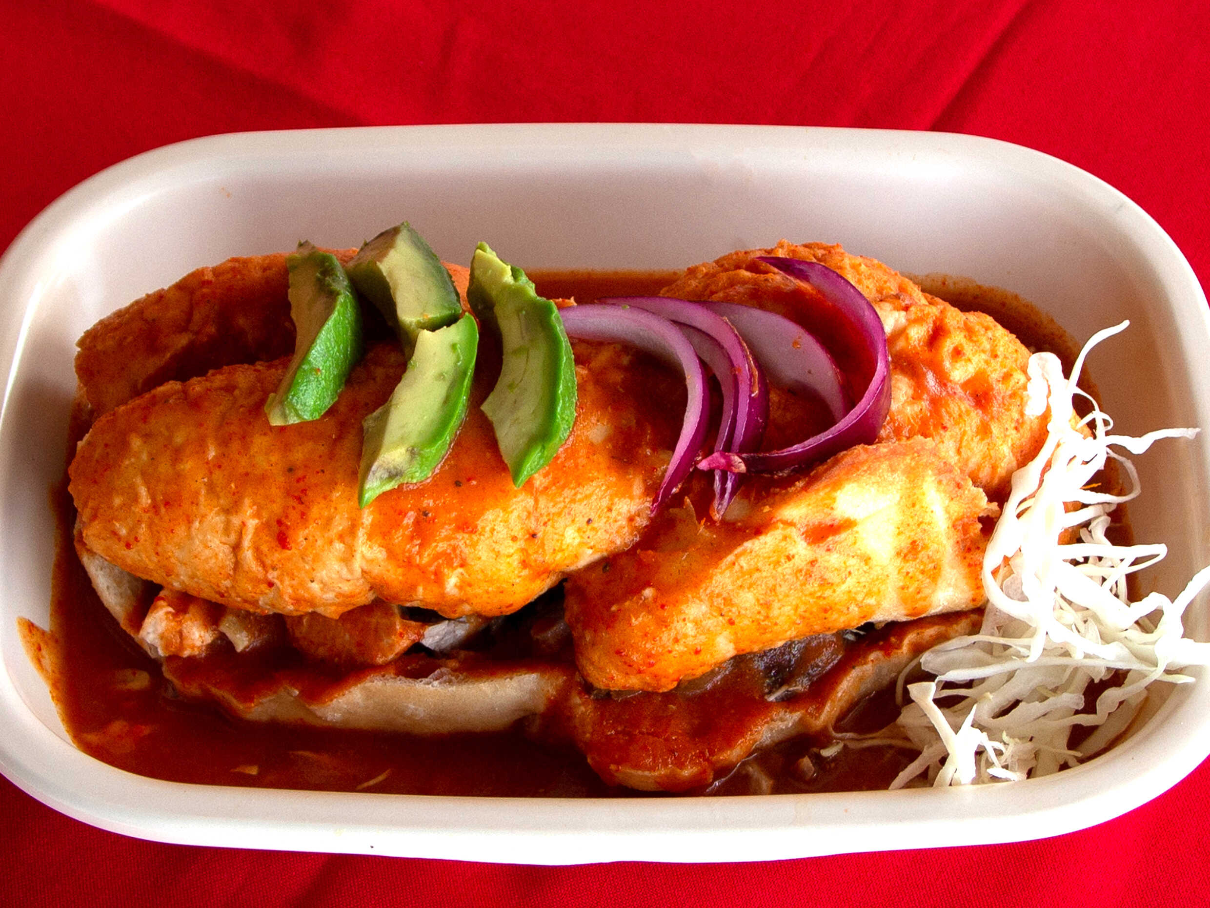 De carnitas, repollo, cebolla morada y aguacate con salsa picosa.