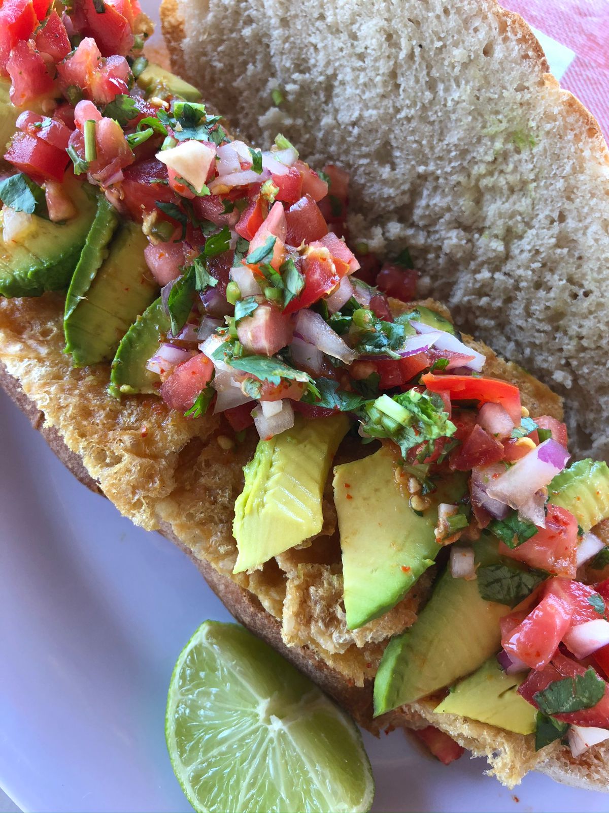 Deliciosa Torta con bolillo artesanal preparada con chicharron, aguacate y pico de gallo.