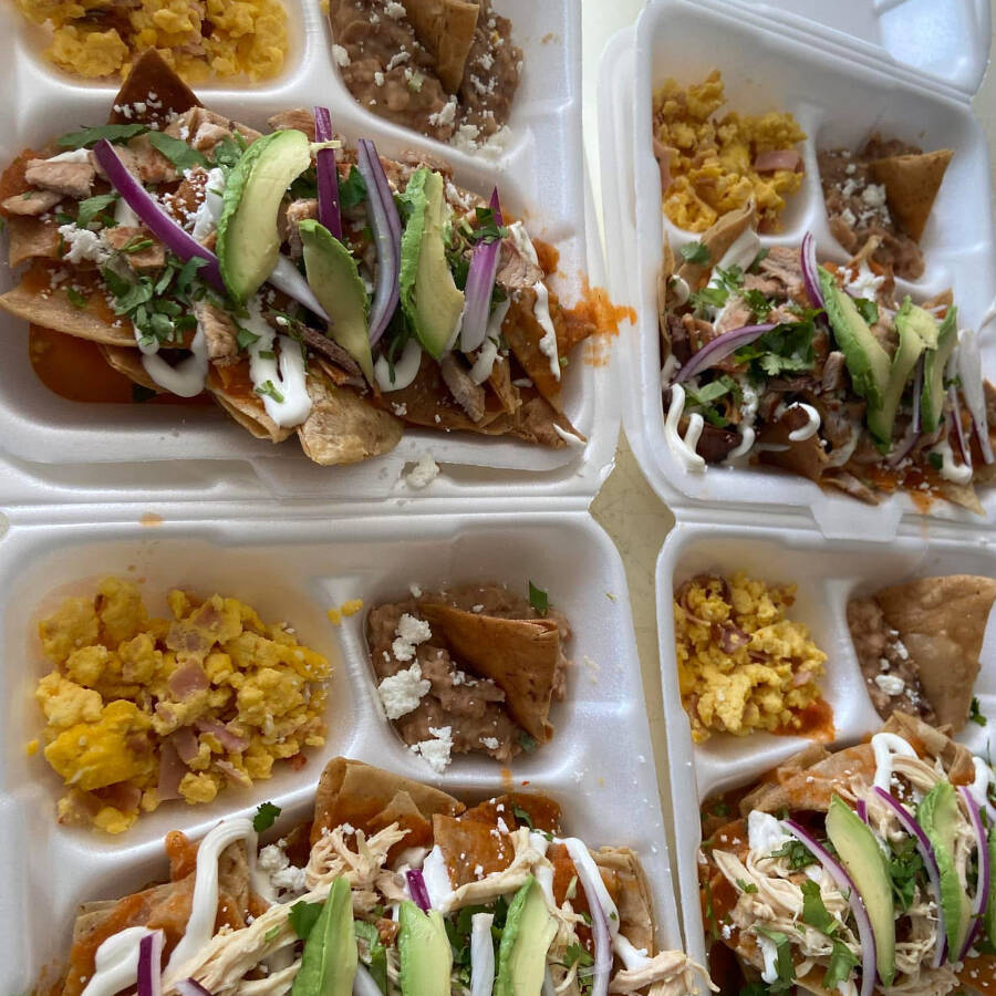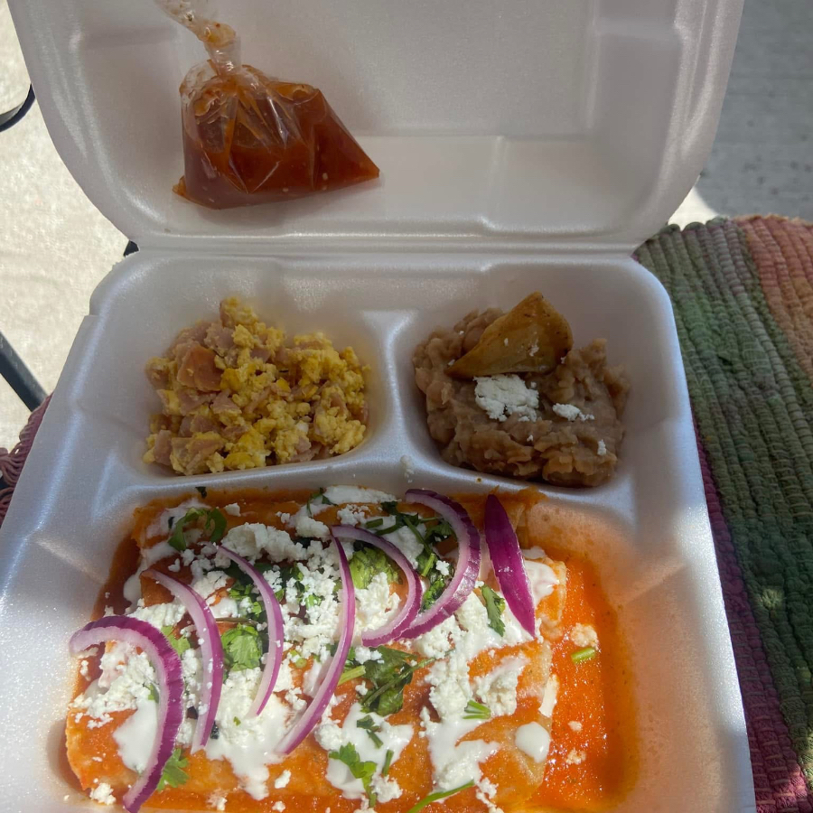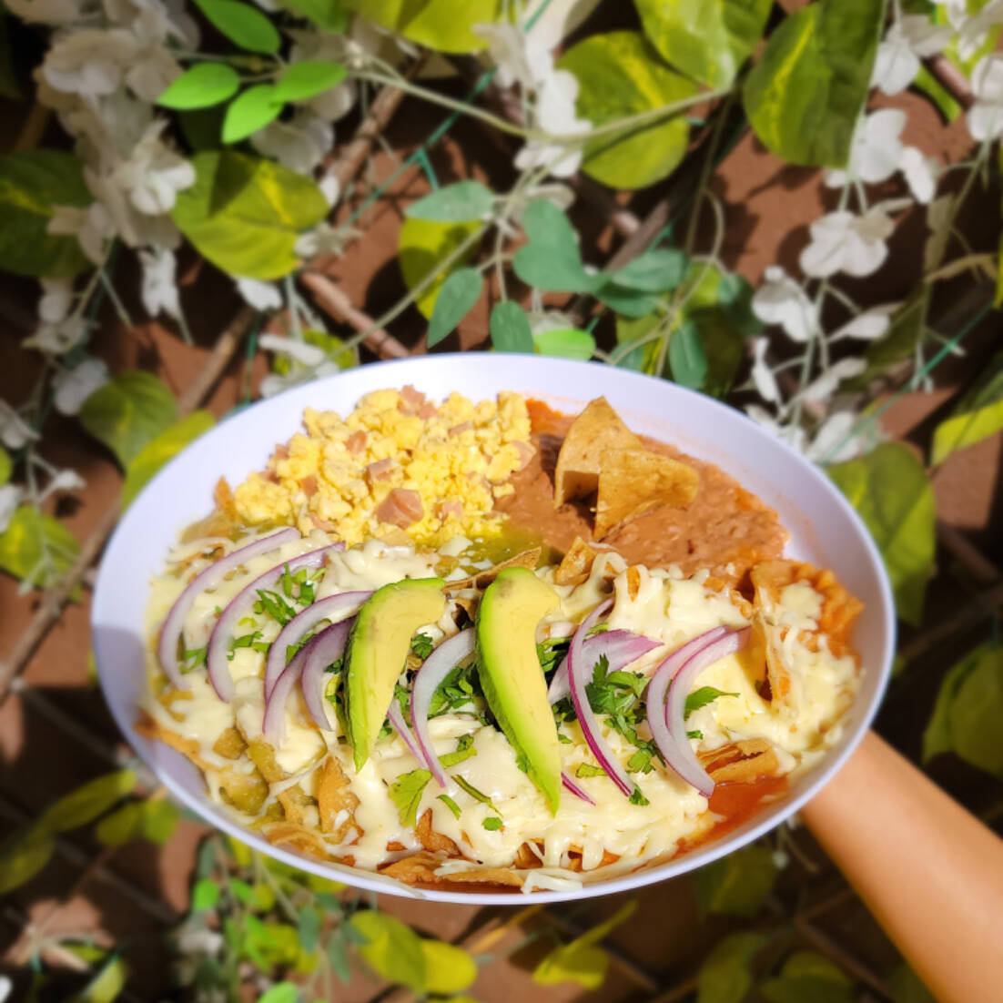 5 tacos de pollo bañados en salsa verde o roja, porción de frijoles y huevo, crema, queso, cebolla y cilantro