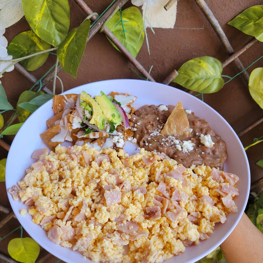 Huevo con jamón o salchicha, porción de chilaquiles rojos o verdes y porción de frijoles
