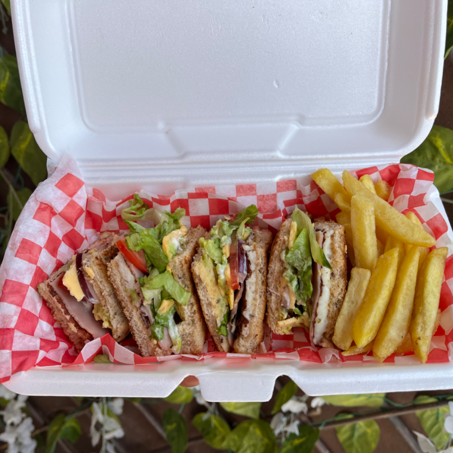 Pan blanco, jamón, queso amarillo, queso asadero, lechuga, jitomate, cebolla, aguacate y papas a la francesa