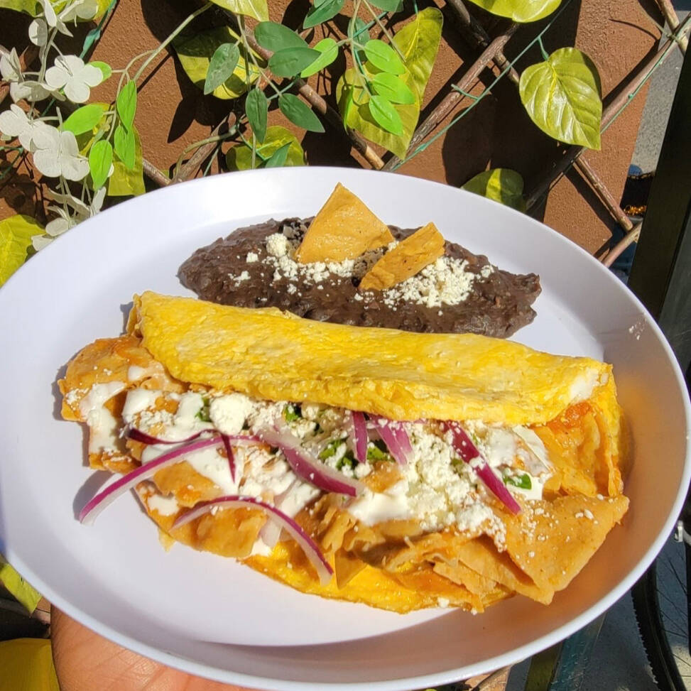 Omelette de huevo, totopos, Salsa a elegir, crema,queso, cebolla, cilantro, porción de frijoles