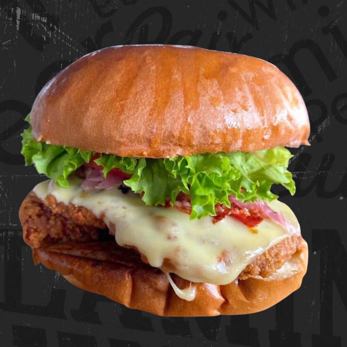 200 g De pechuga de pollo empanizada con un toque picante; tocino ahumado, queso gouda, lechuga, jitomate y vinagreta de cebolla; servida con papas a la francesa y chimichurri.