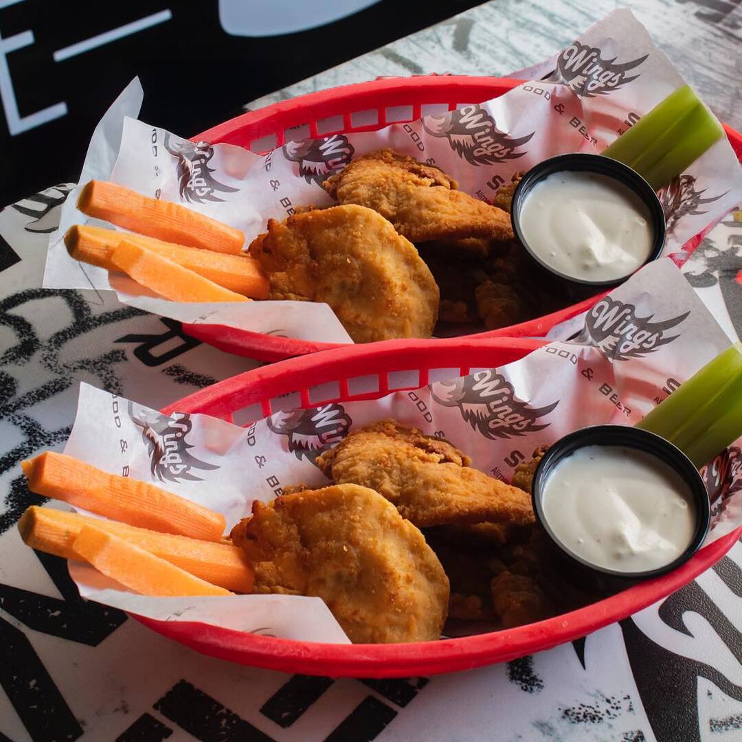 Alitas fritas bañadas en la salsa de tu preferencia, acompañadas con vegetales y aderezo blue cheese o ranch a escoger.