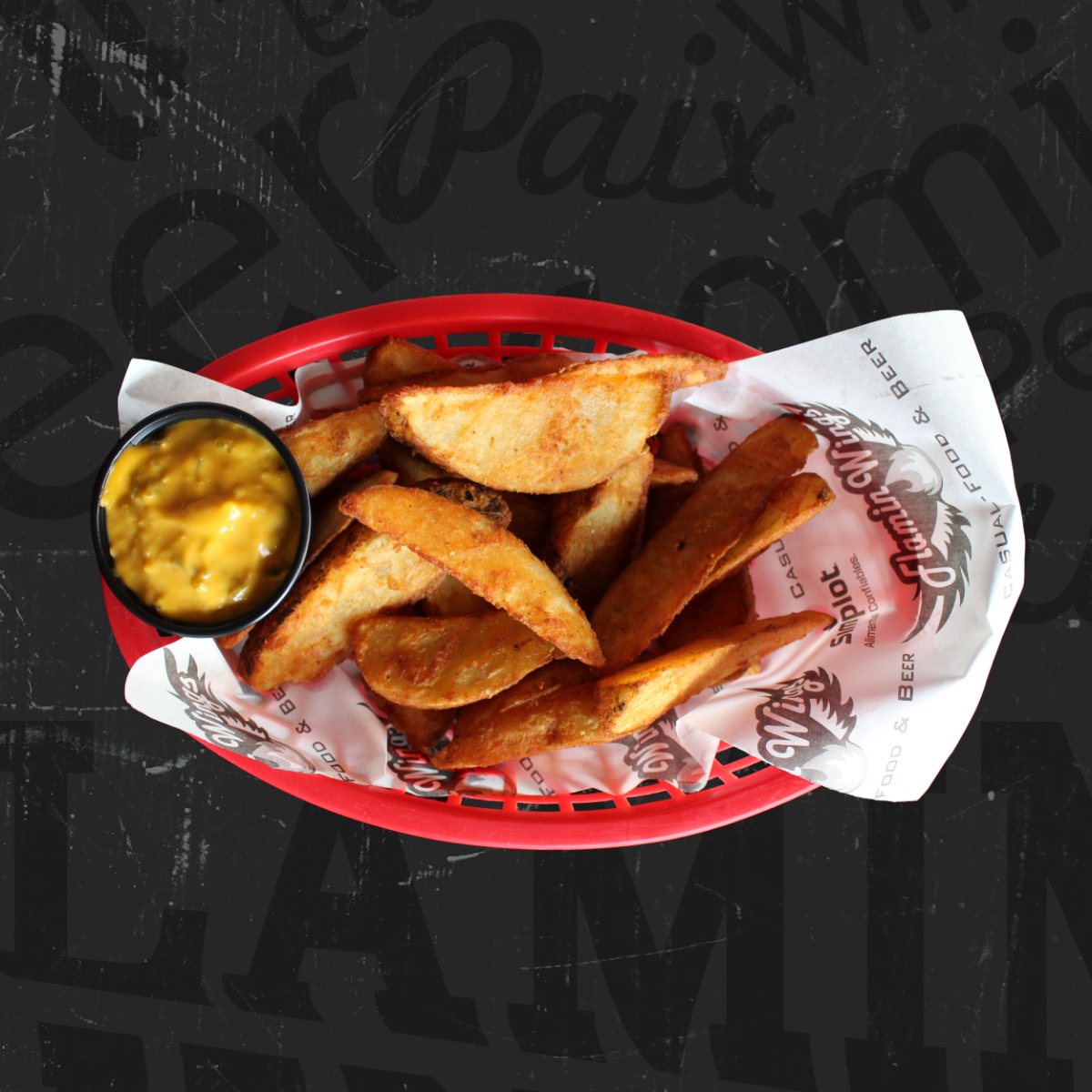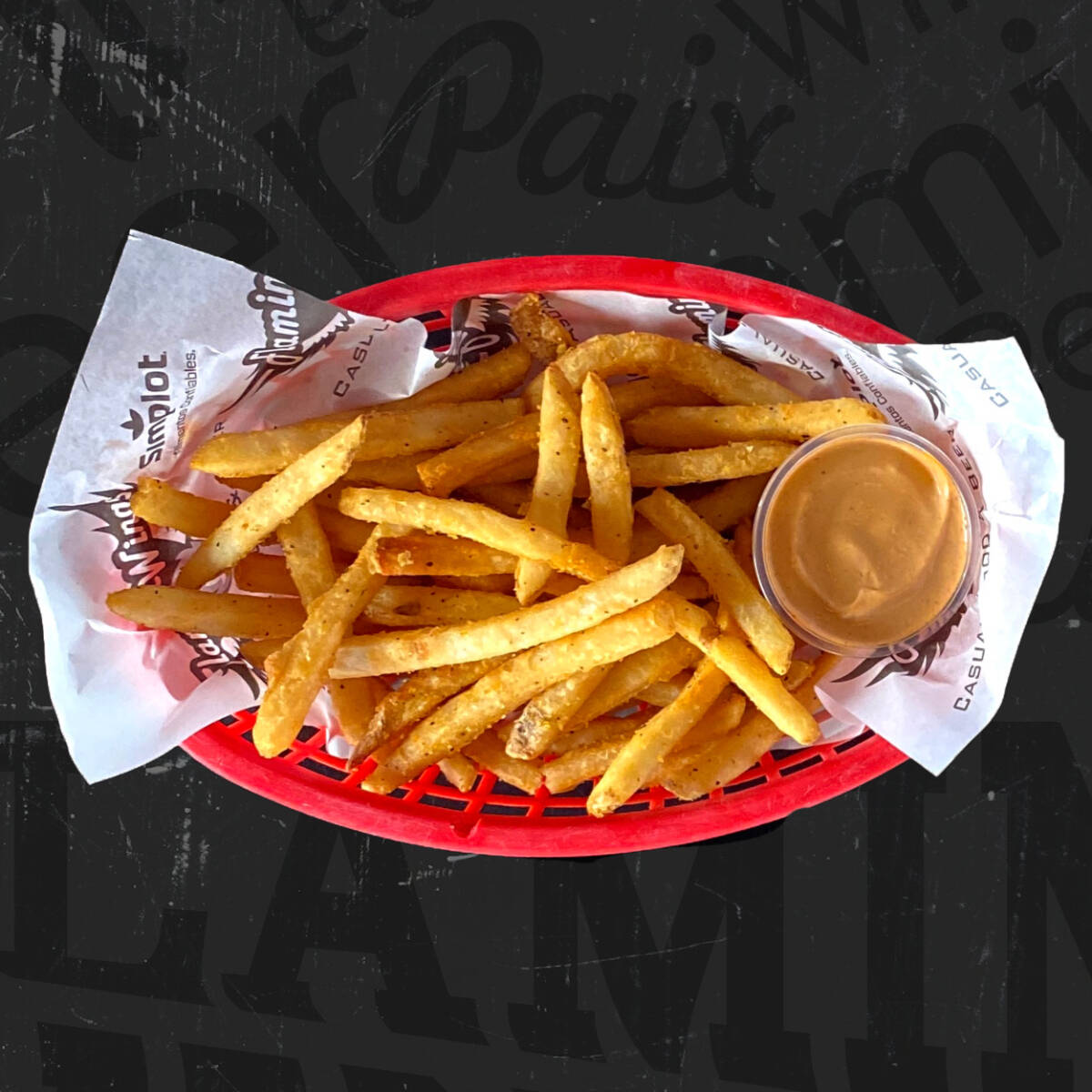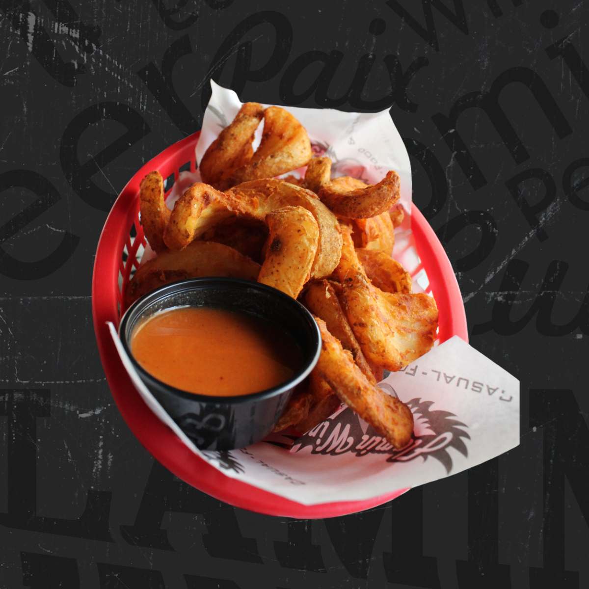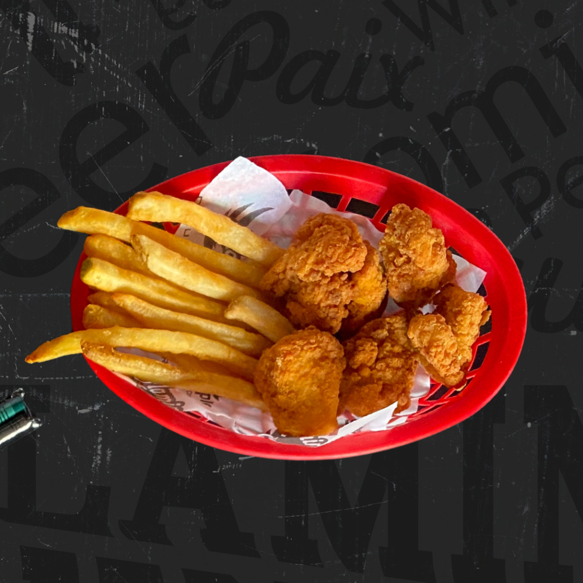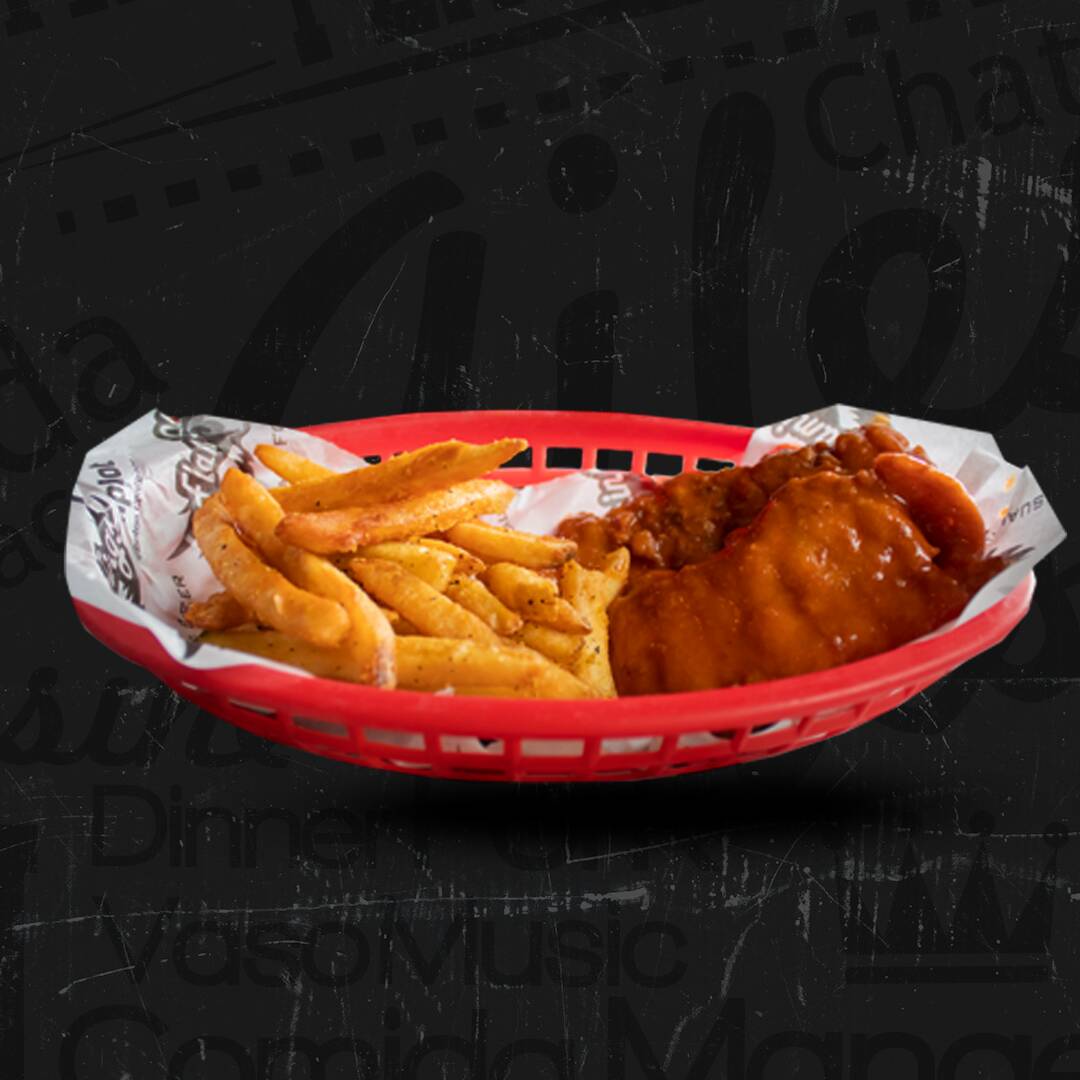 Originales trozos de costillas de cerdo fritas al estilo flamin bañadas en la salsa de tu preferencia y acompañadas con papas a la francesa. (No incluye aderezo).