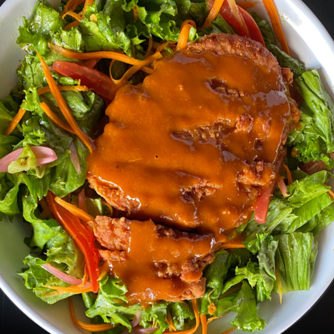 200 g De pechuga de pollo empanizada con un toque picante, lechuga italiana, jitomate, zanahoria, cebolla morada; servida con salsa original y aderezo blue cheese.