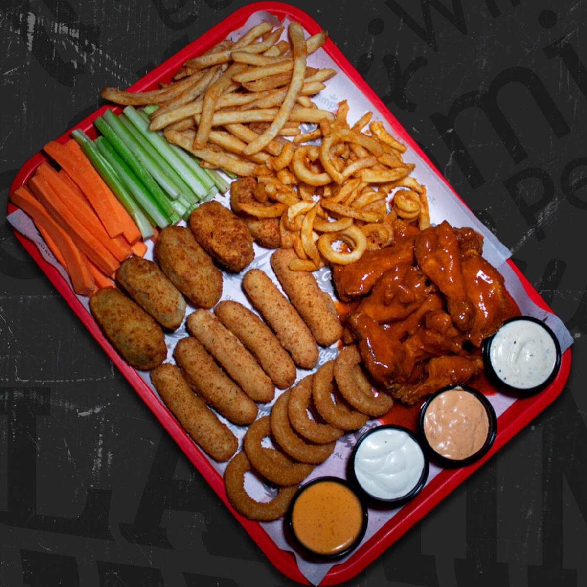 1.5 kg Wings, 300 g de tenders, 300 g de boneless, 1 orden de papas a la francesa, 600 ml de salsa (3 sabores), 6 aderezos.