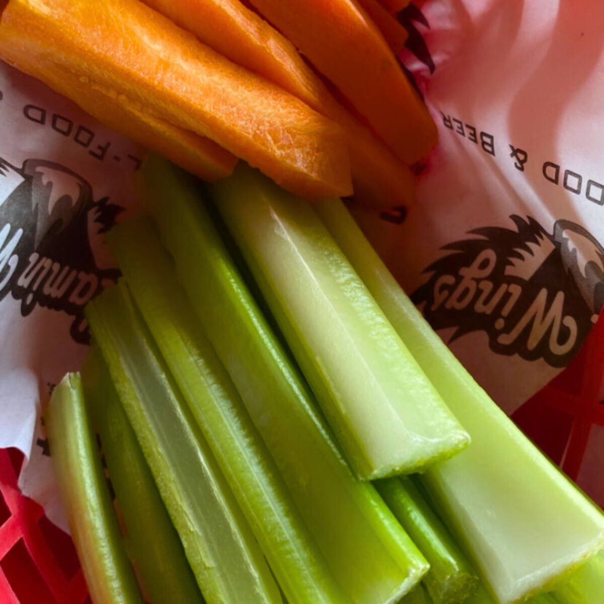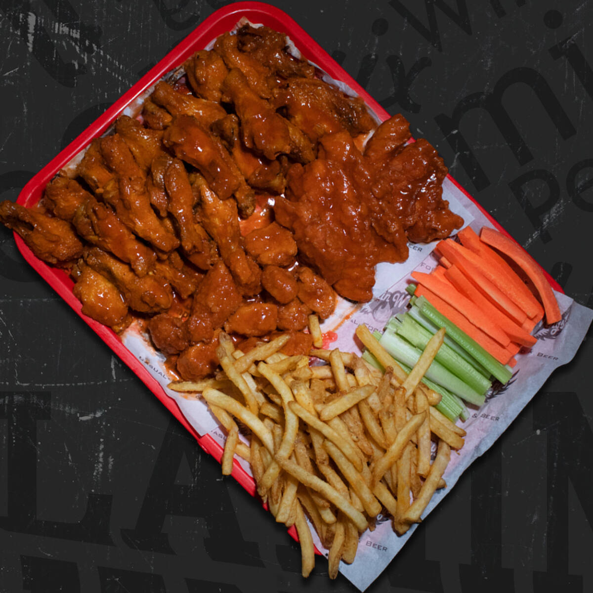 Alitas fritas bañadas en la salsa de tu preferencia, acompañadas con vegetales y aderezo blue cheese o ranch a escoger.