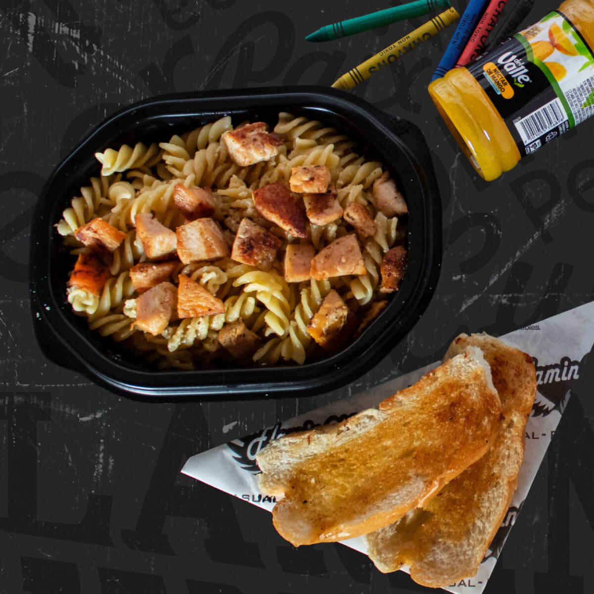 150 g De cuadritos de pechuga de pollo a la parrilla, servidos sobre pasta preparada con mantequilla y queso parmesano. Te regalamos un jugo 250 g.