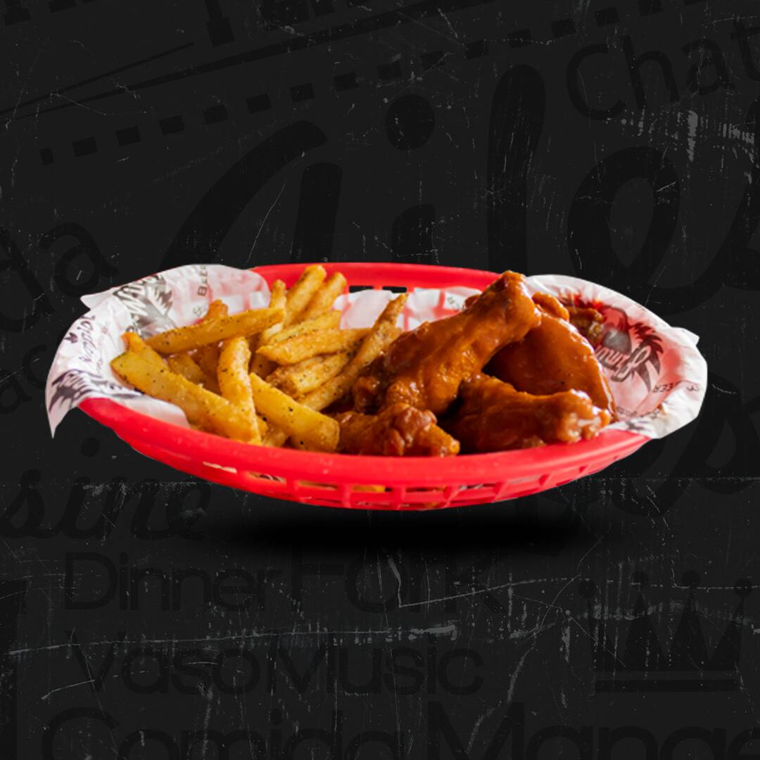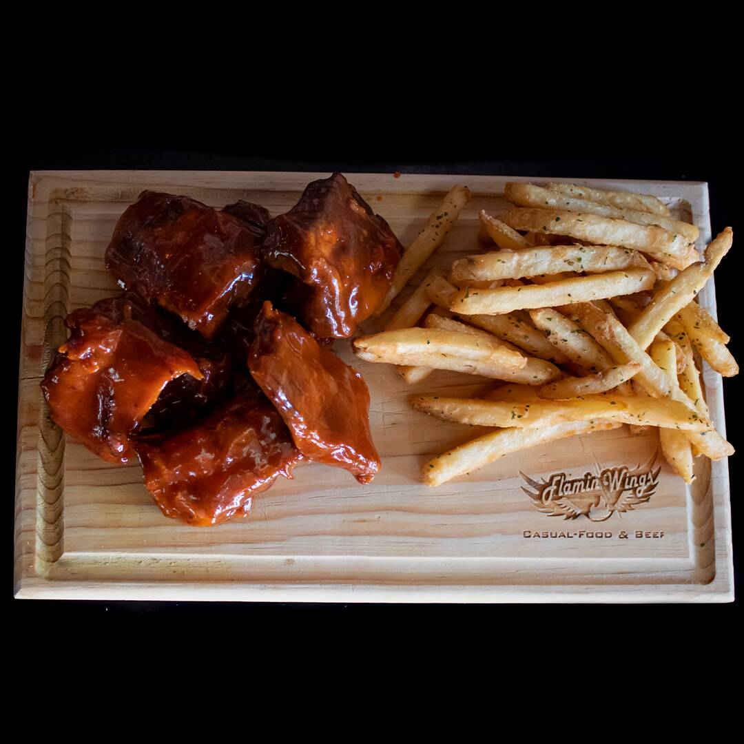 Originales trozos de costillas de cerdo fritas al estilo flamin bañadas en la salsa de tu preferencia y acompañadas con papas a la francesa. (No incluye aderezo).