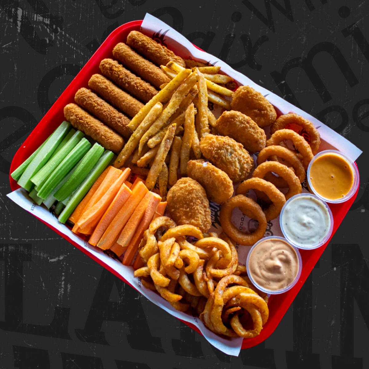 Tus snacks favoritos: 12 boneless, 6 dedos de queso, 6 aros de cebolla. 225 g de papas a la francesa y vegetales con aderezo blue cheese y chipotle.