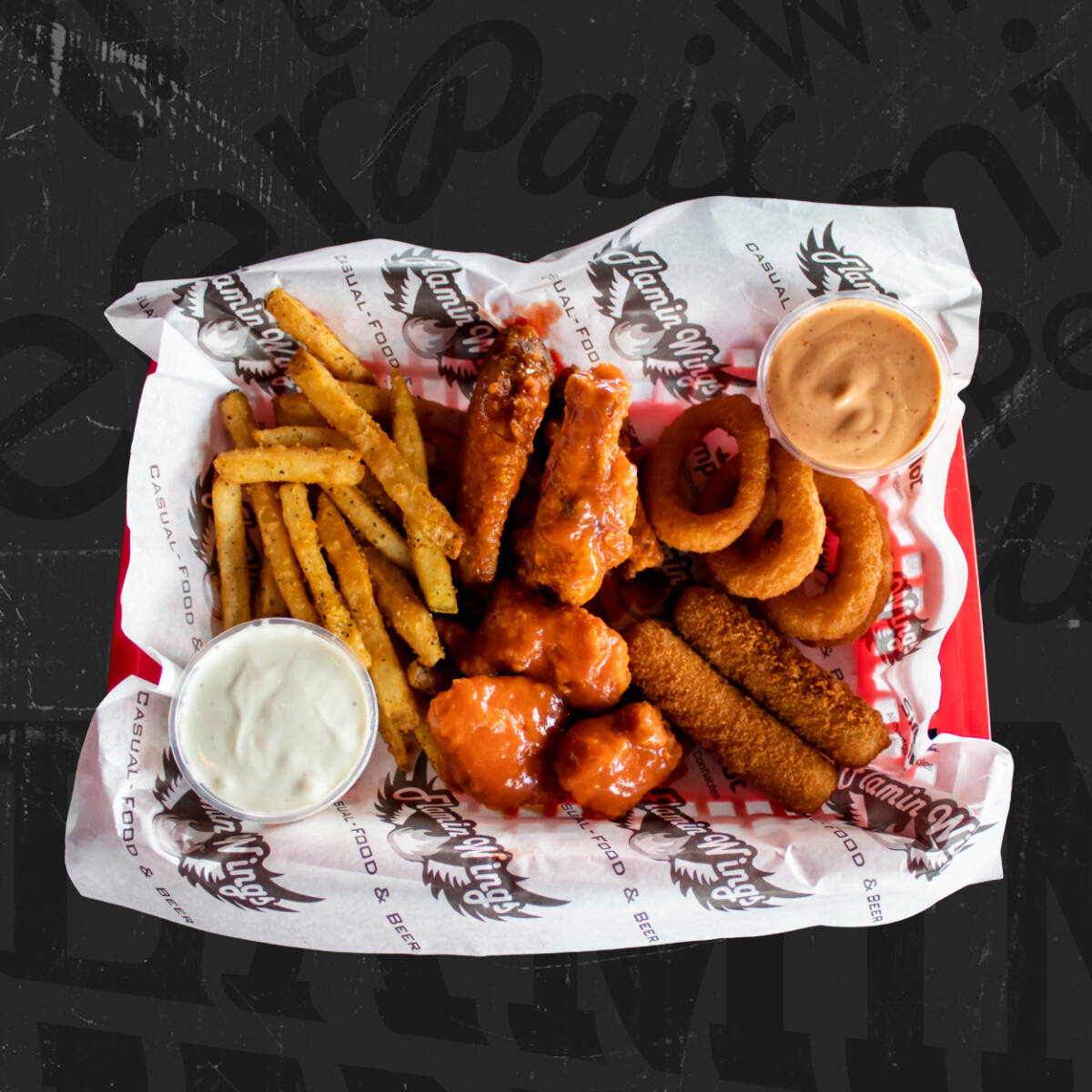 1 Combo flamin (samplers) 500 g, wings 150 ml de salsa (1 sabor), 4 aderezos.