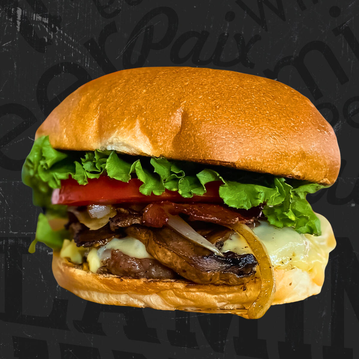 200 g De prime steaks a la parrilla; queso gouda, champiñones, cebolla asada, tocino ahumado, lechuga y jitomate; servida con papas gajo y chimichurri.