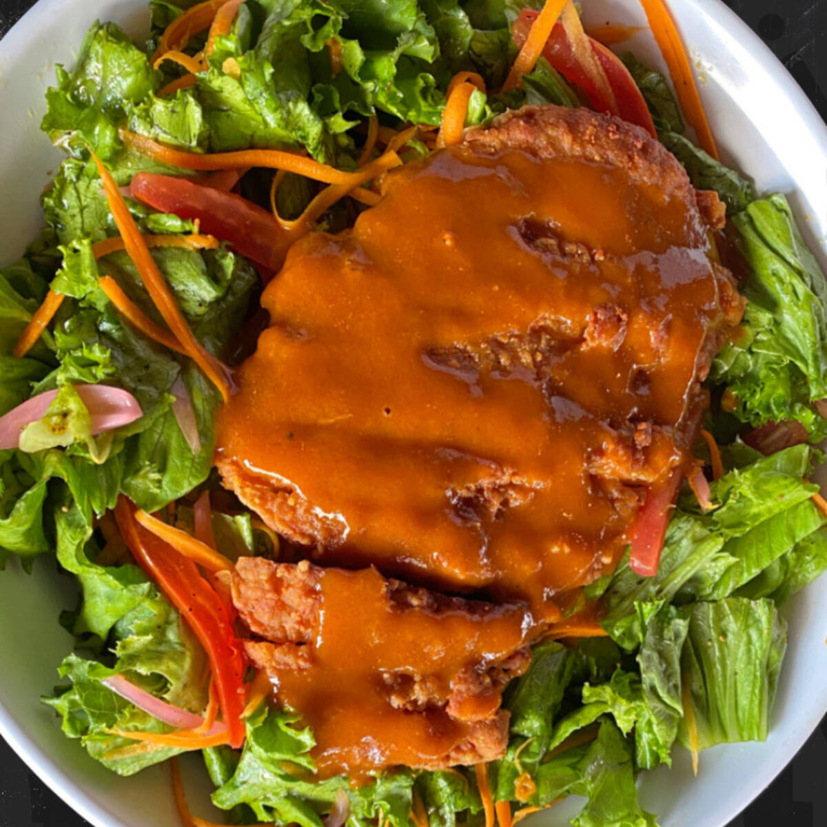 200 g De pechuga de pollo empanizada con un toque picante, lechuga italiana, jitomate, zanahoria, cebolla morada; servida con salsa original y aderezo blue cheese.