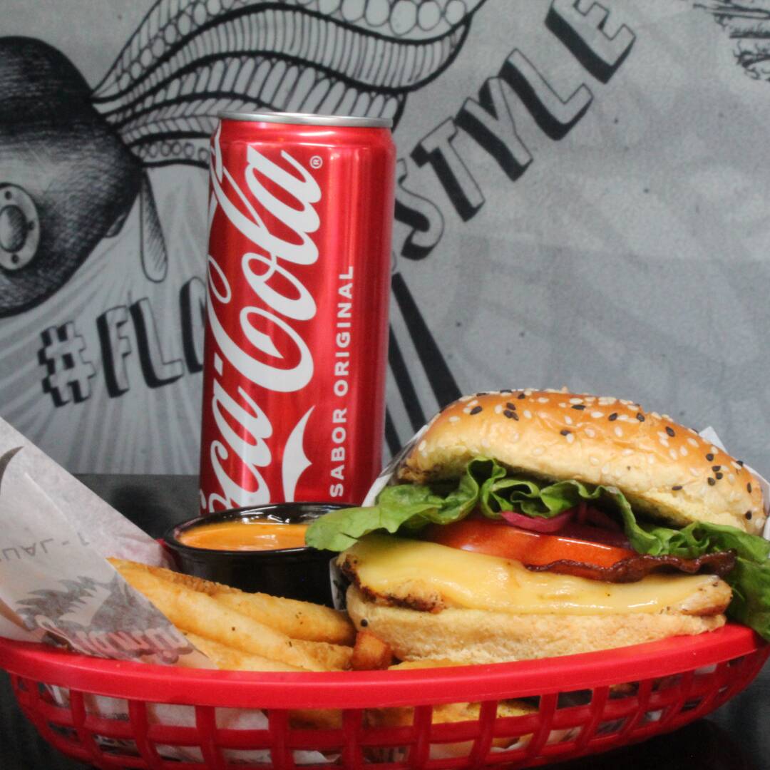 180 g De pechuga de pollo a la parrilla; tocino ahumado, queso gouda, lechuga, jitomate y vinagreta de cebolla; servida con papas a la francesa y chimichurri.