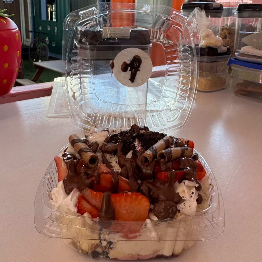 Untable + fresas frescas + crema freséate + topping + jarabe + wafer stick