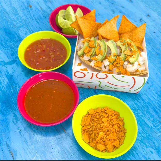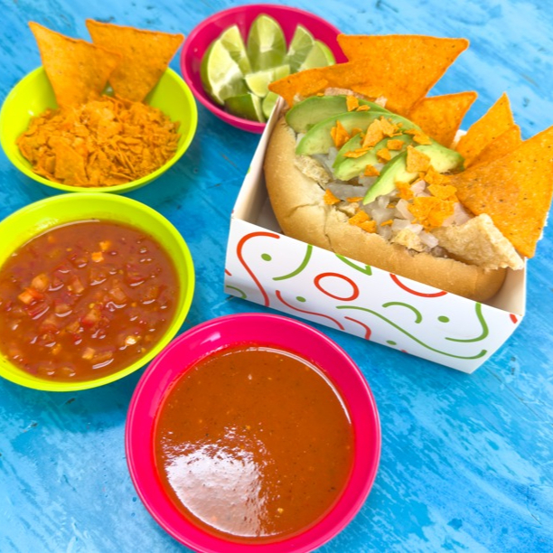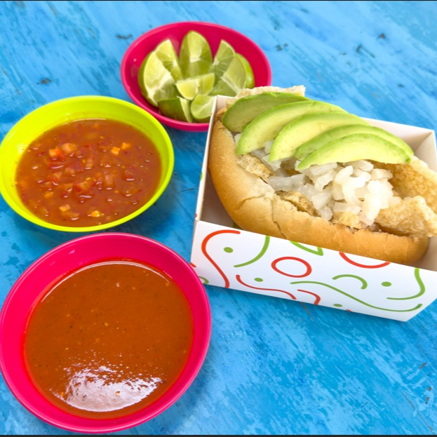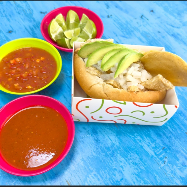 Bolillo con chicharrón, cueritos, salsas de la casa, aguacate y doritos, sabor y crunch extra.