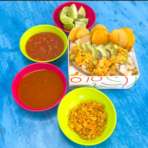 3 Tacos de aire con cueritos, salsas de la casa, aguacate y doritos.