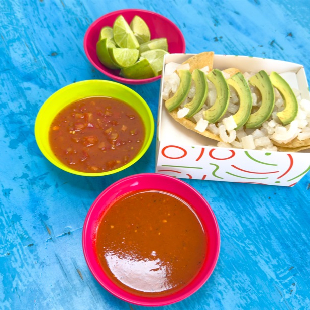 3 Tacos de aire con cueritos, salsas de la casa y aguacate.