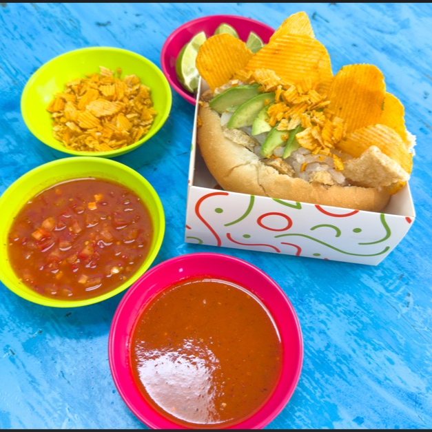 Bolillo con chicharrón, cueritos, salsas de la casa, aguacate y ruffles, crunch perfecto.