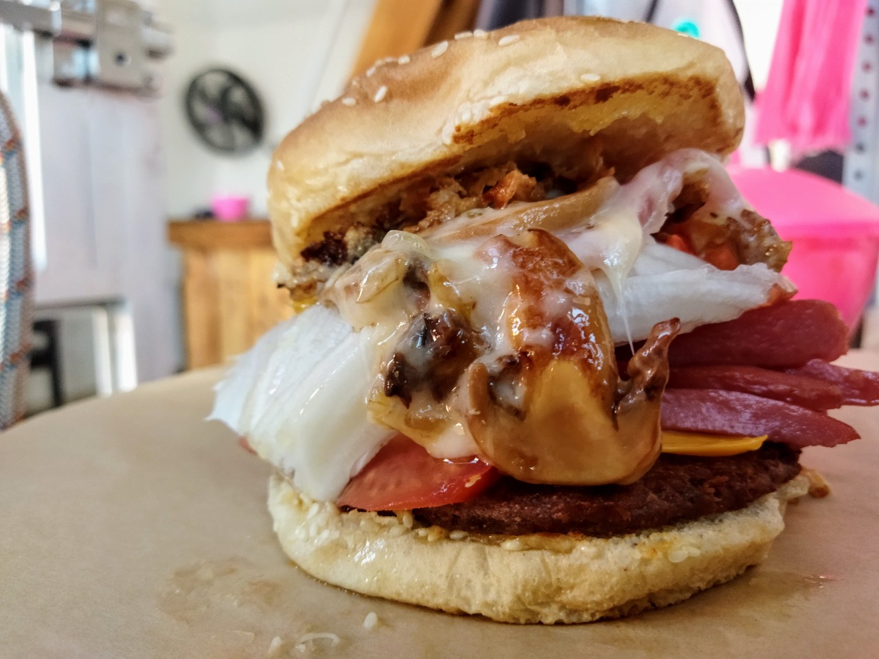Deliciosa hamburguesa con carne a la plancha, champiñones sazonados en una costra de queso mozzarella, jamón, salchicha, queso amarillo, lechuga y jitomate dentro de un delicioso pan jumbo semi-tostado.