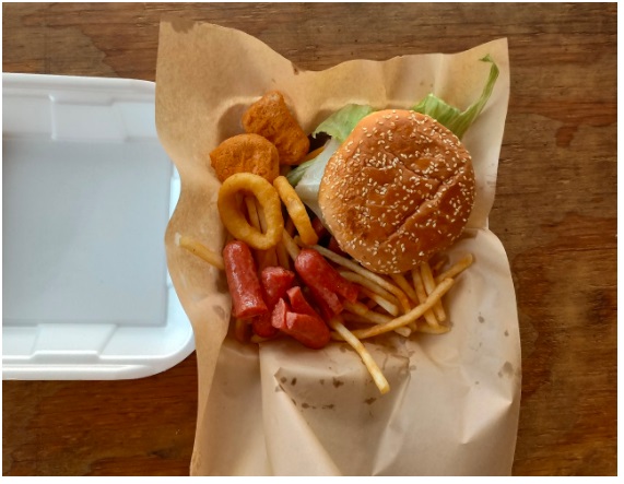 Combo especial de la barra, incluye hamburguesa especial, papas a la francesa, salchipulpos, nuggets de pollo y aros de cebolla.