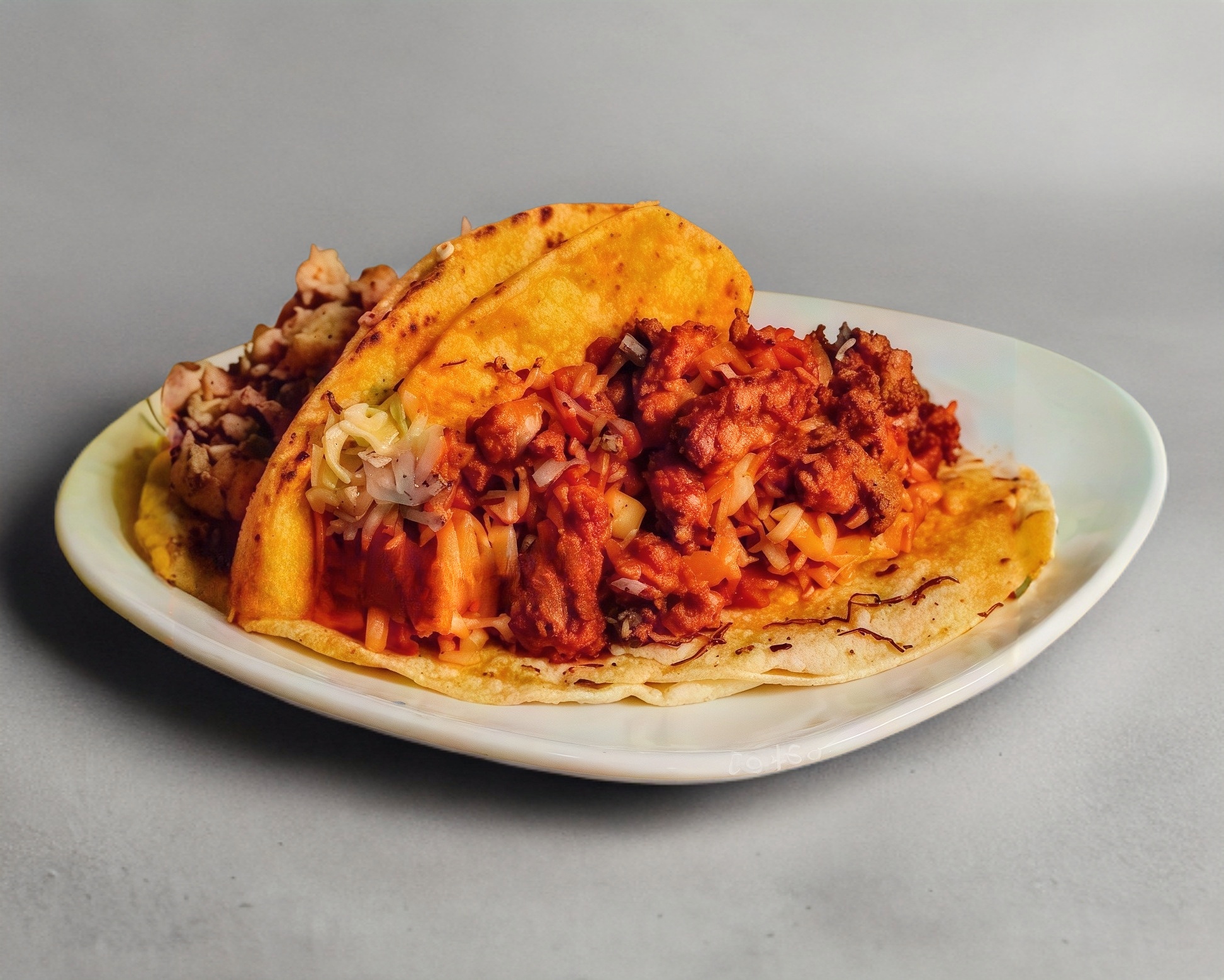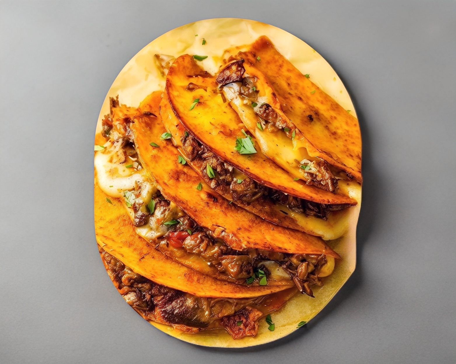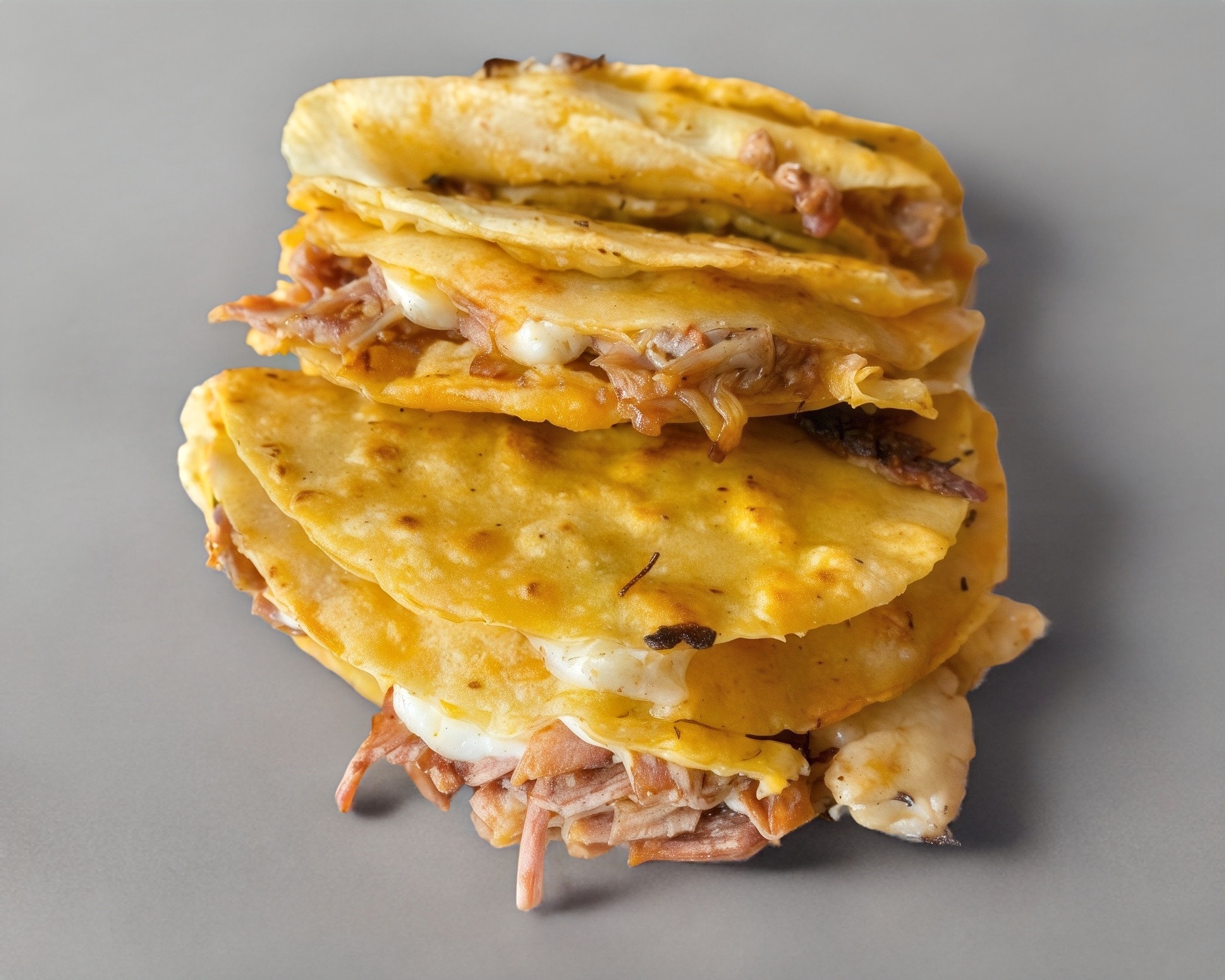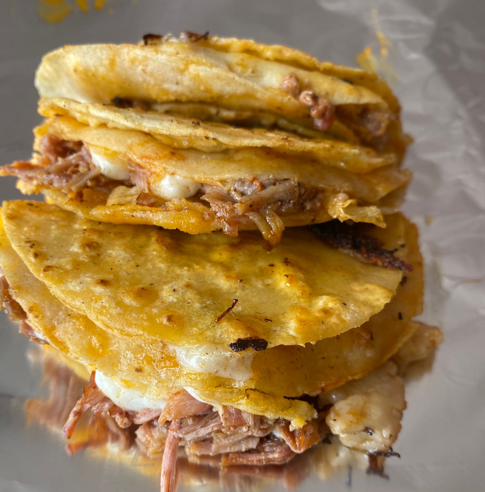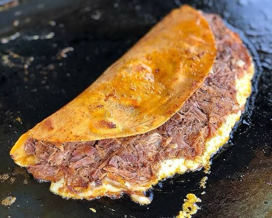 Tortilla de maíz con queso y birria de res.