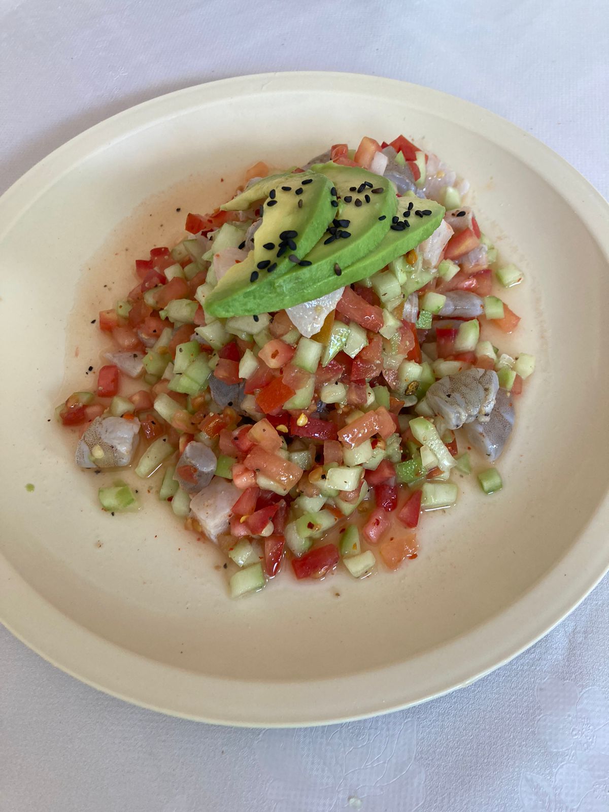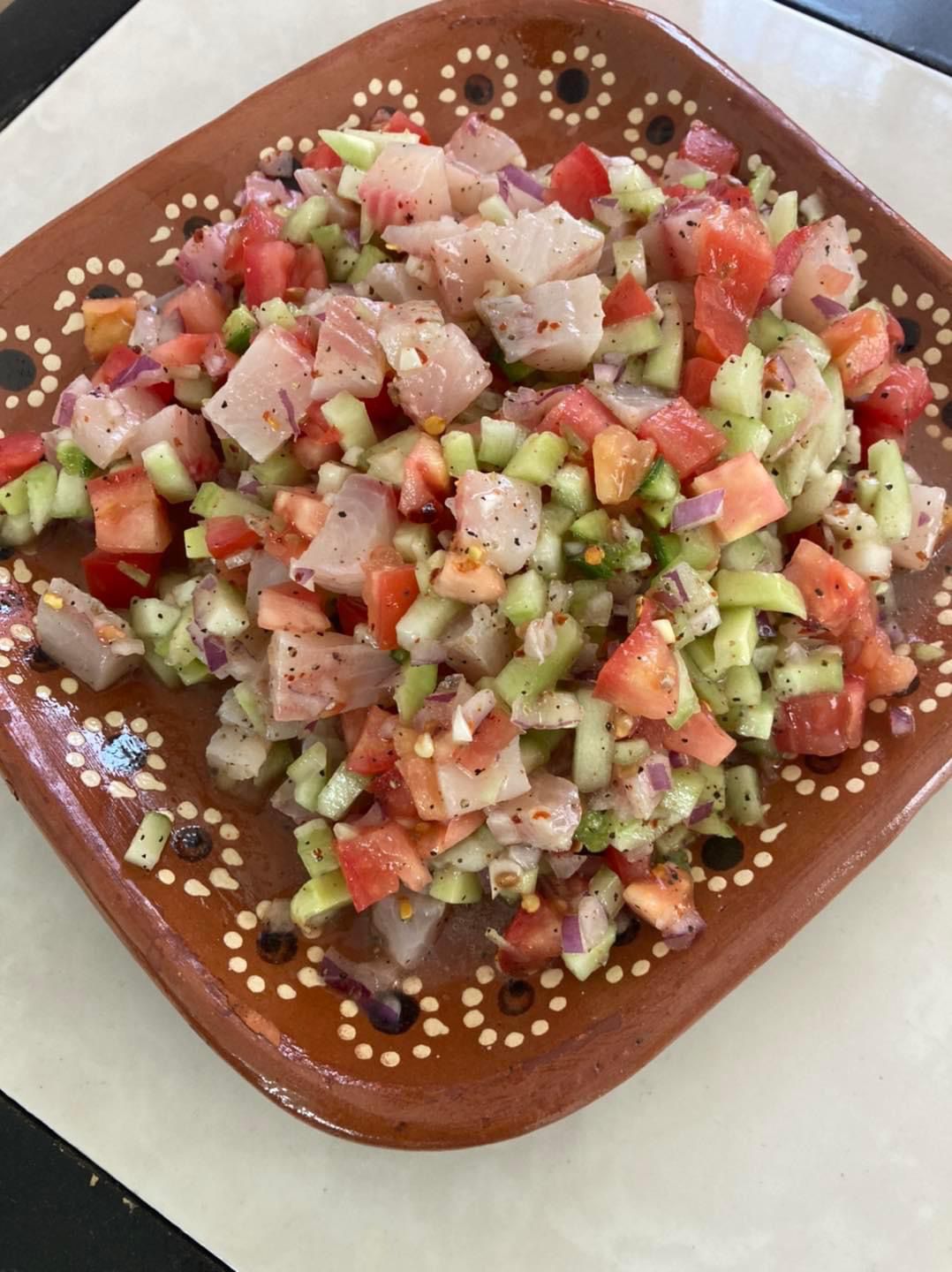 Trozos de Camaron y Pescado curtido con limón y verdura; realizados al momento.