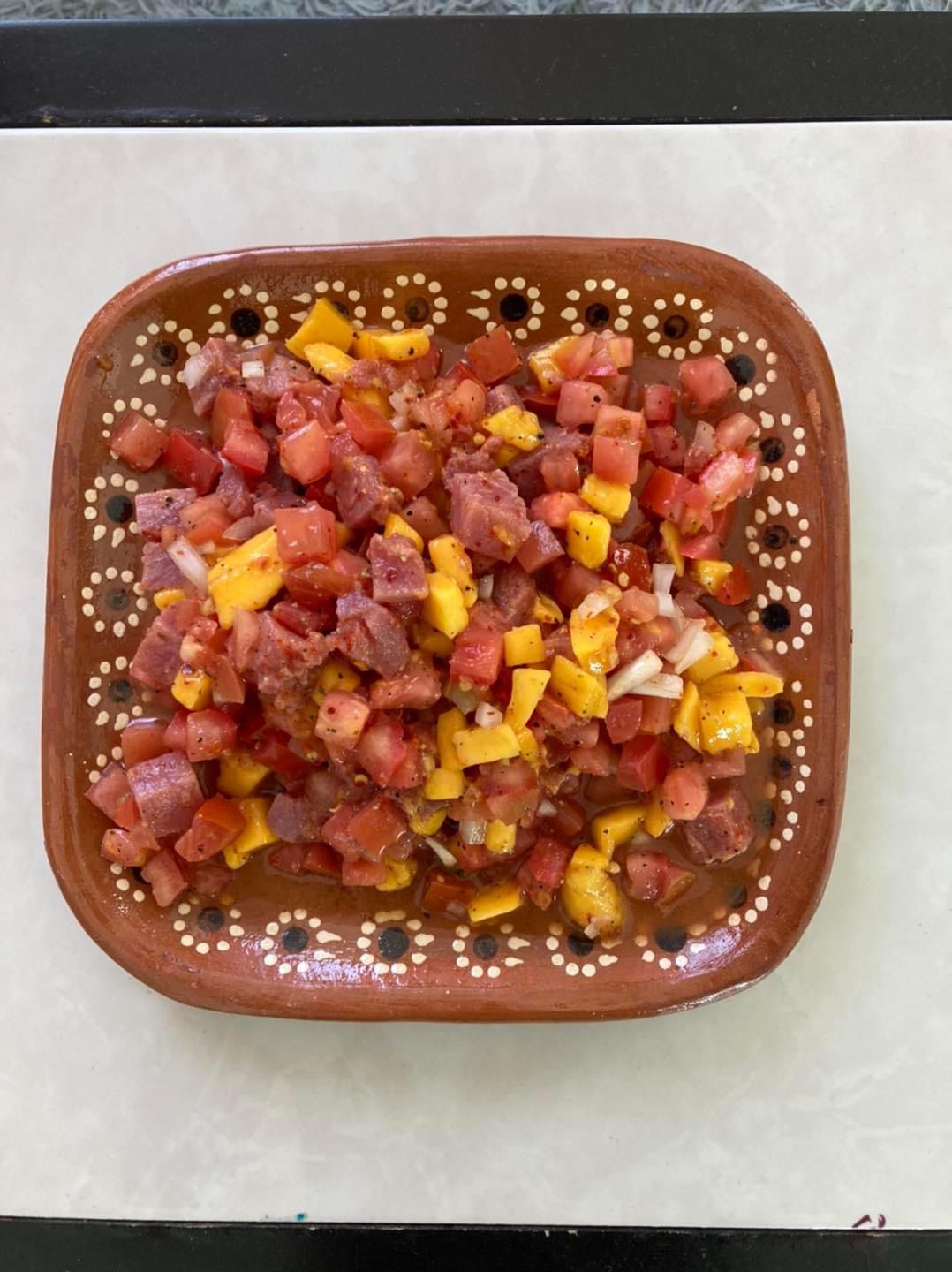 Medallon de atun picado en cuadros , mezclado con mango, jitomate y una salsa de 3 chiles.