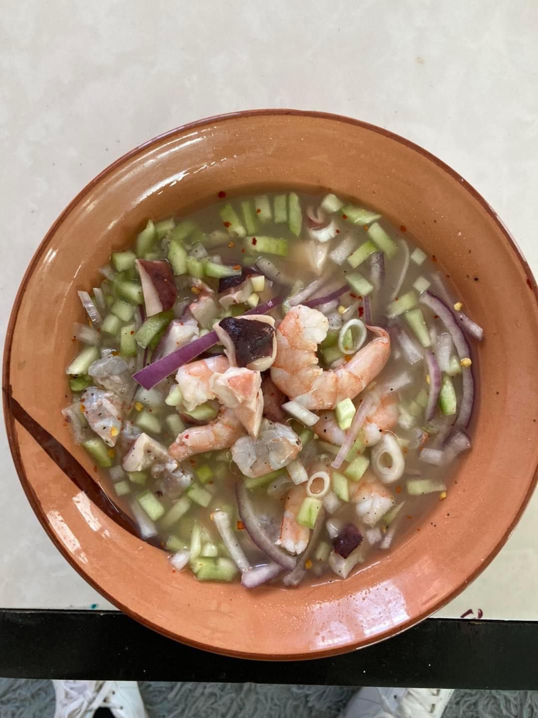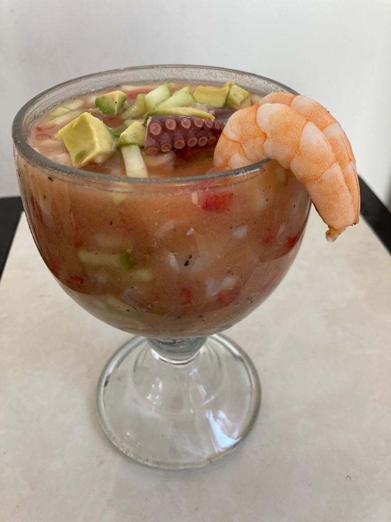 Camarón curtido con limon, camaron cocidfo al fuego, pescado y pulpo acompañado con caldo de camarón estilo mazatlan.