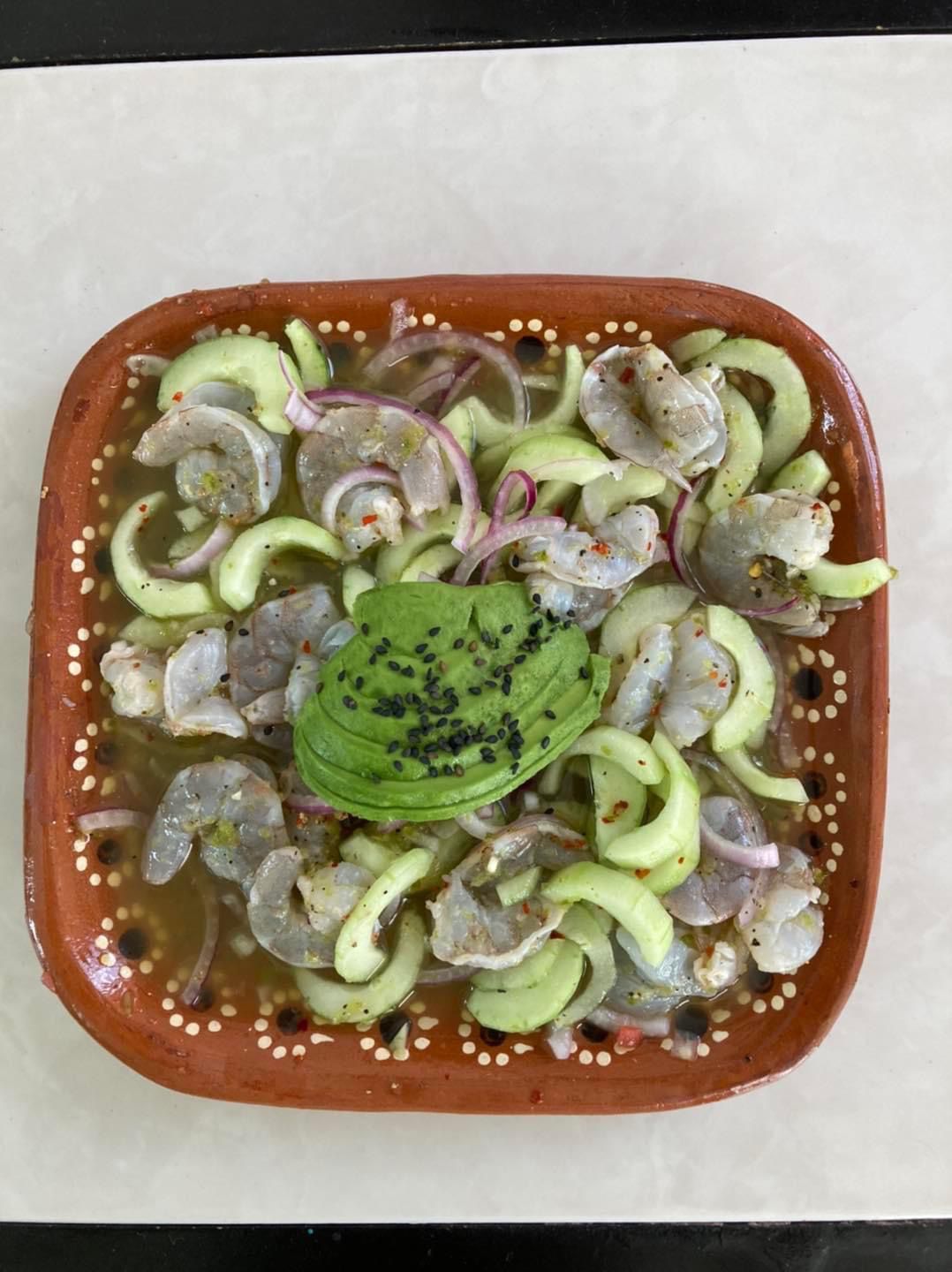 Camaron abierto en corte tipo mariposa, con pepino y cebolla morada, curtidos con limon y salsa verde clásica de chile serrano.