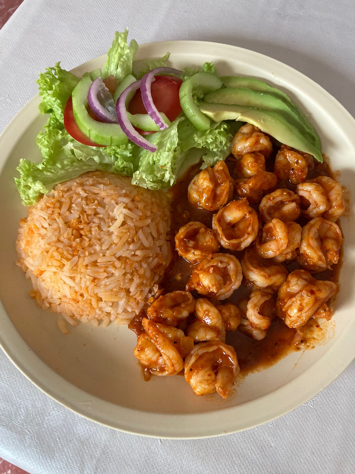 Camarones guisados en salsa a la diabla acompañado de ensalada y arroz.