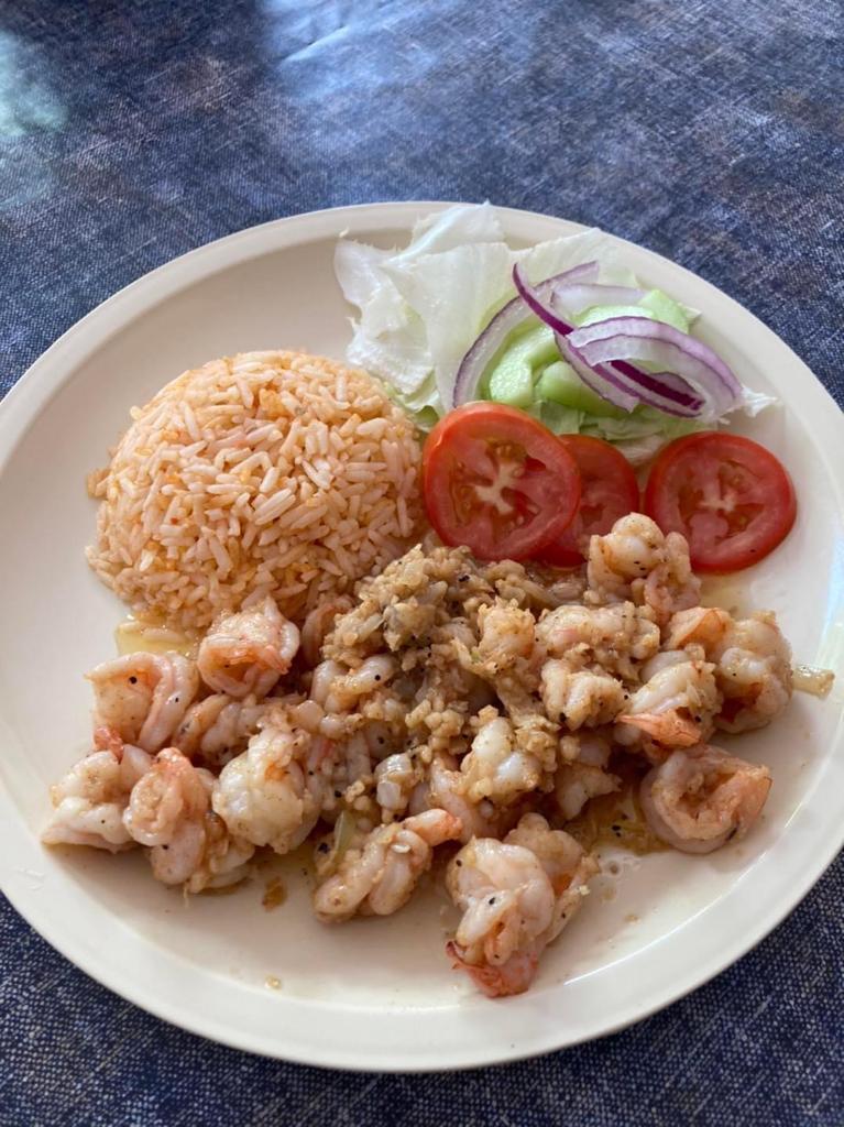 Camarones guisados con ajo y mantequilla, acompañado de ensalada y arroz.