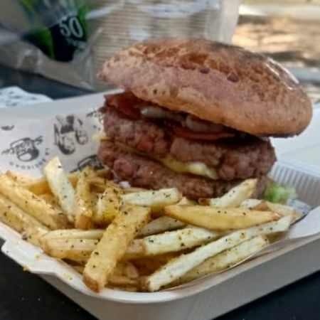Pan Artesanal, aderezo original (L.S.S) 120 Gr de carne selecta, 30 gr de queso manchego, lechuga italiana, jitomate bola y cebolla morada del día. Acompañadas con papas Artesanales