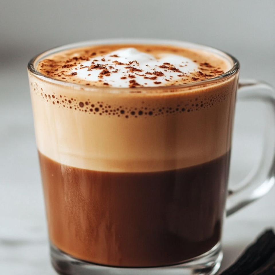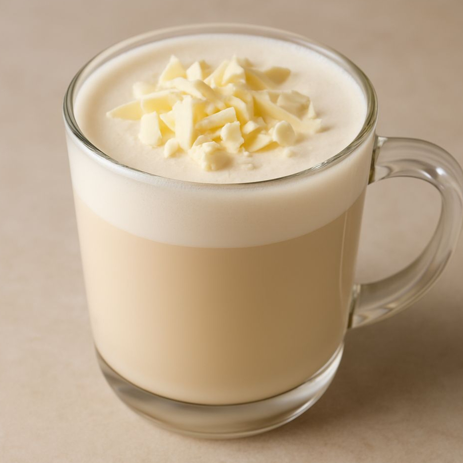 Chocolate blanco + espresso + leche caliente. Ultra cremoso.