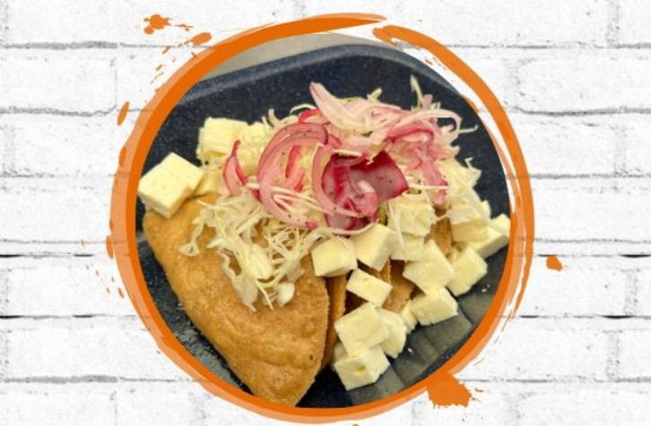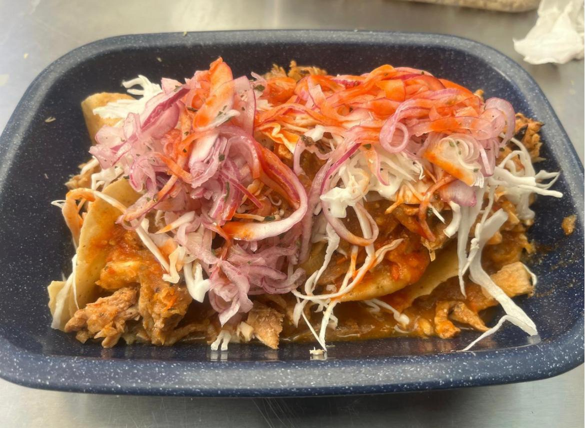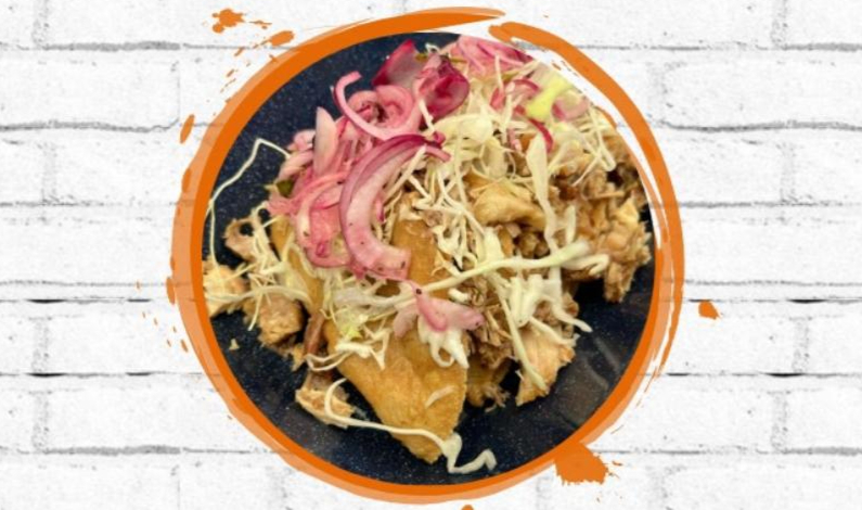 acompañada de salsa de jitomate, cebolla, col y salsa extra picante