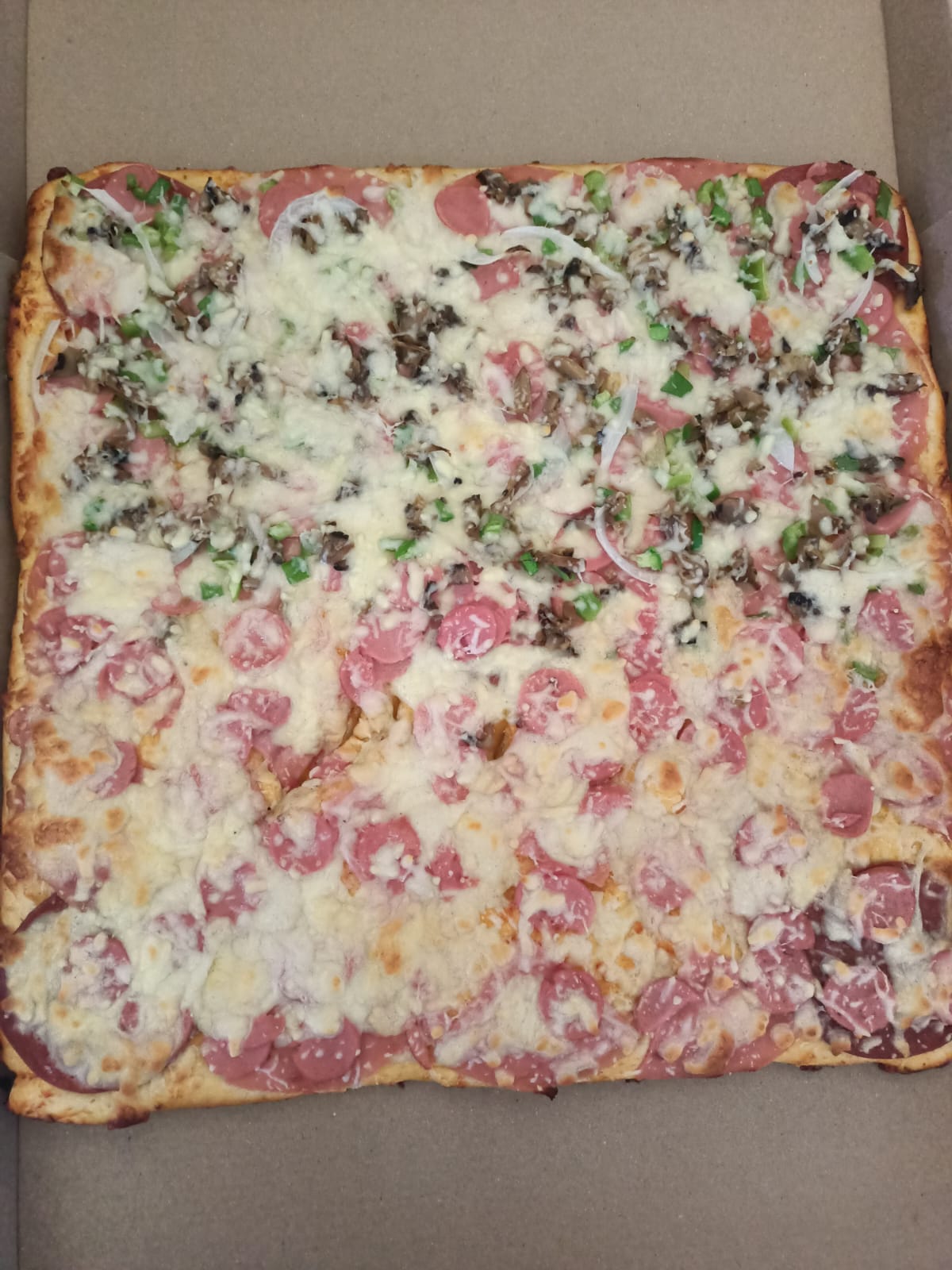 Jamón, salami, champiñón, salchicha, pimento y cebolla.