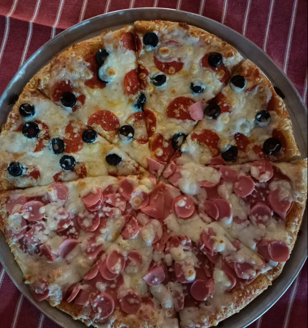 Jamón, pepperoni, champiñones y pimiento.