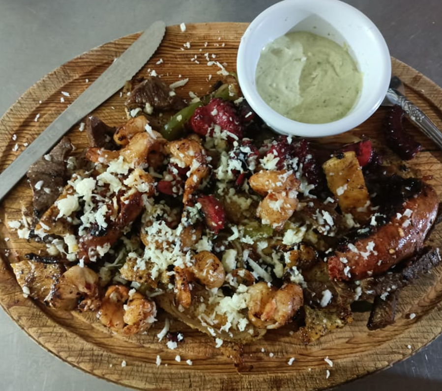 Camarón, pulpo, arrachera, chorizo, pollo y queso.