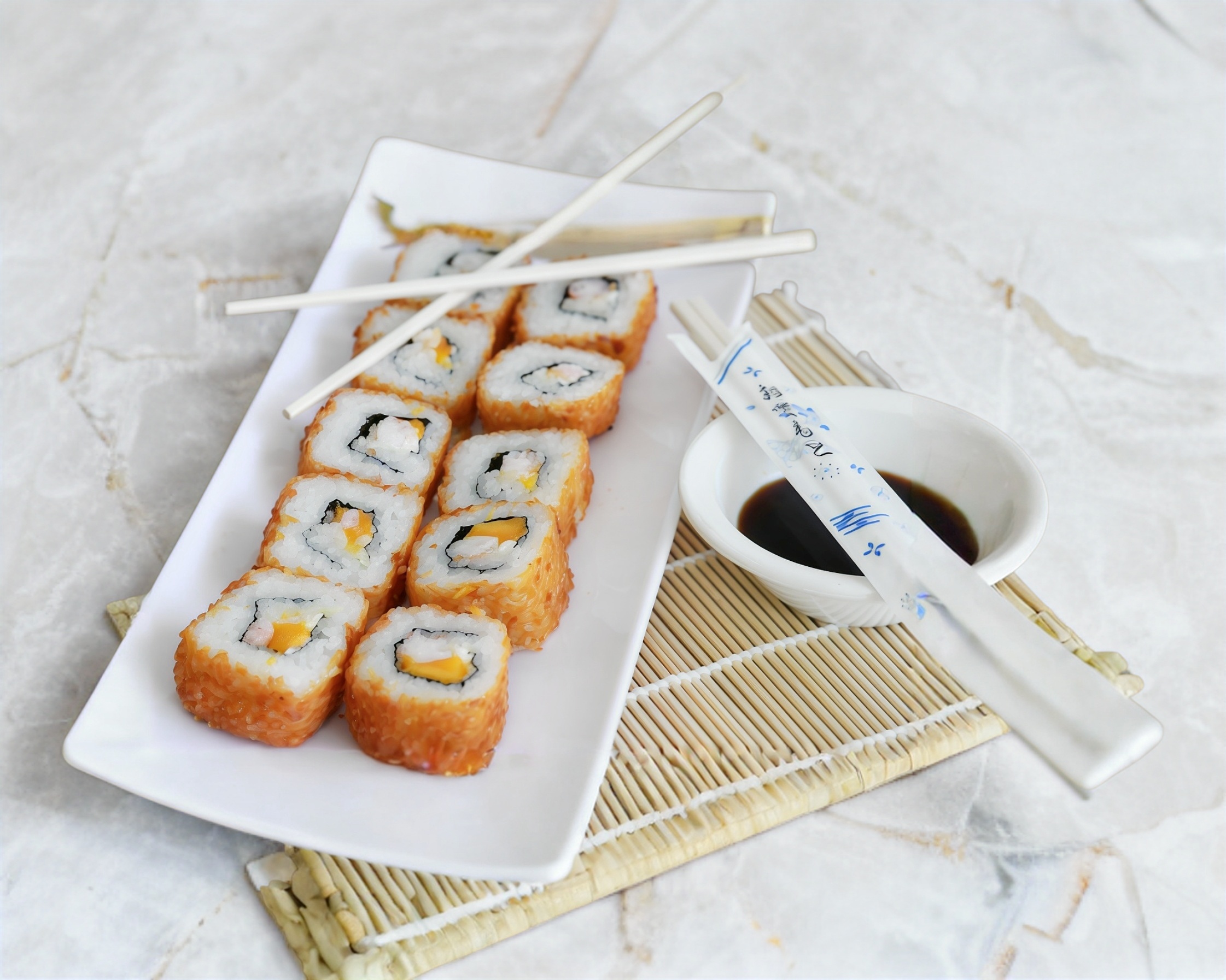 Dentro: Surimi, manchego y salmón Fuera Salsa anguila y tampico