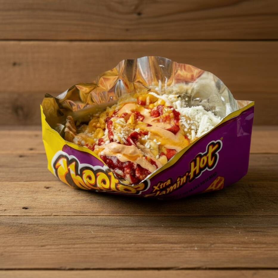 Tostitos Flamin Hot, elote desgranado a elegir, crema, mayonesa, salsa de elote, queso amarillo, queso blanco y 1 topping a elegir