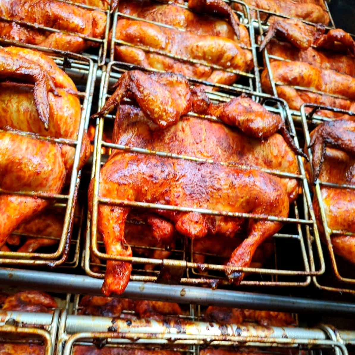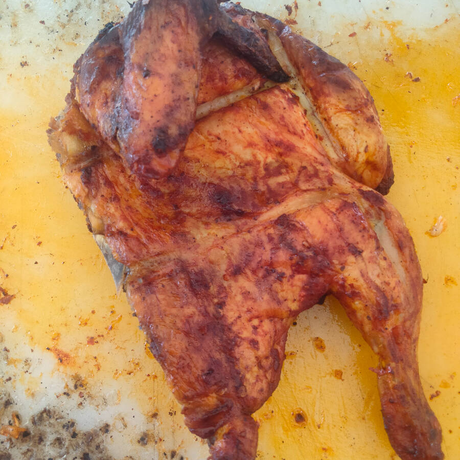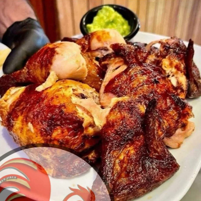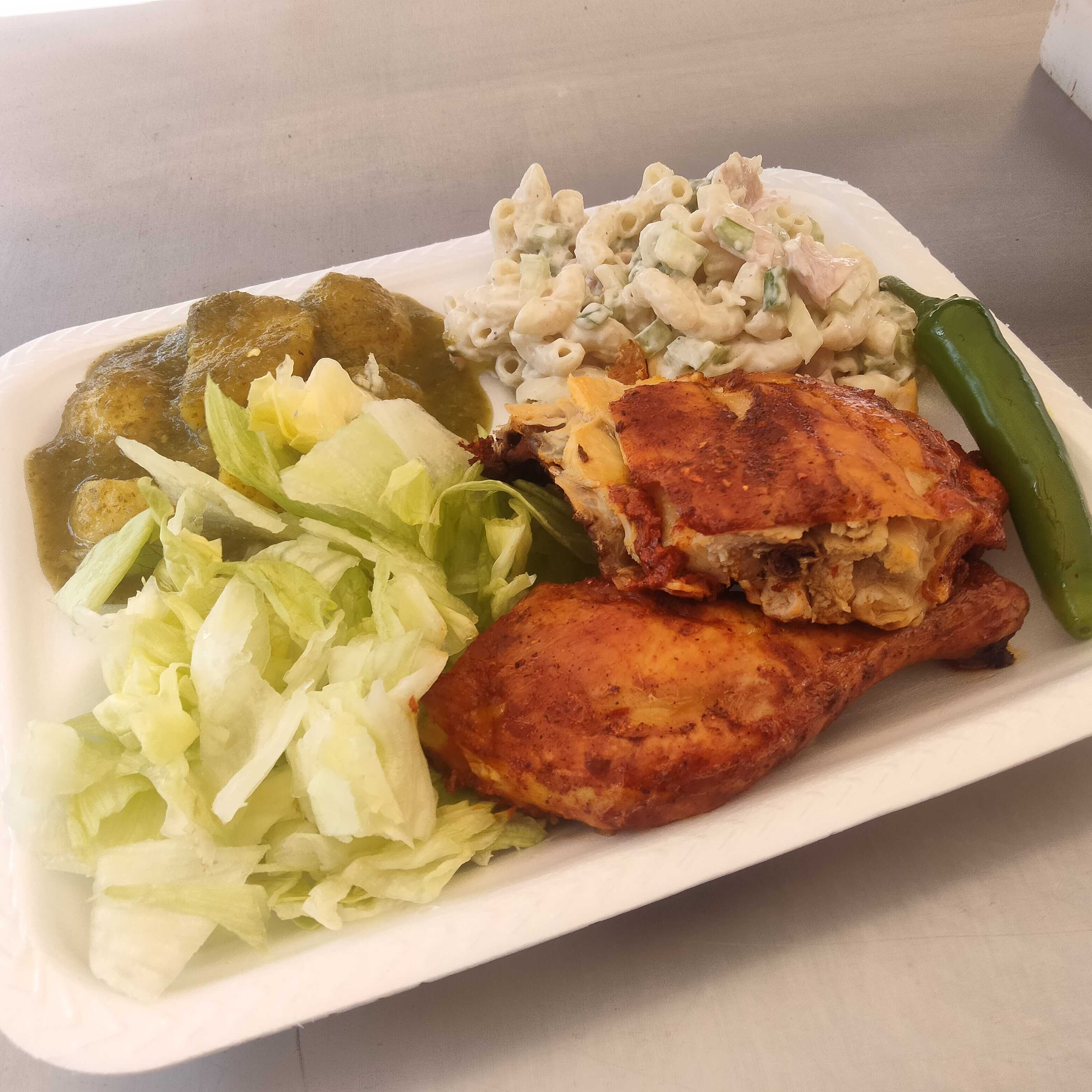 Pollo de 1.3 kg marinado en adobo especial de la casa, acompañado de salsa roja, salsa verde, degustación de papas guisadas, lechuga, chiles toreados, tortillas