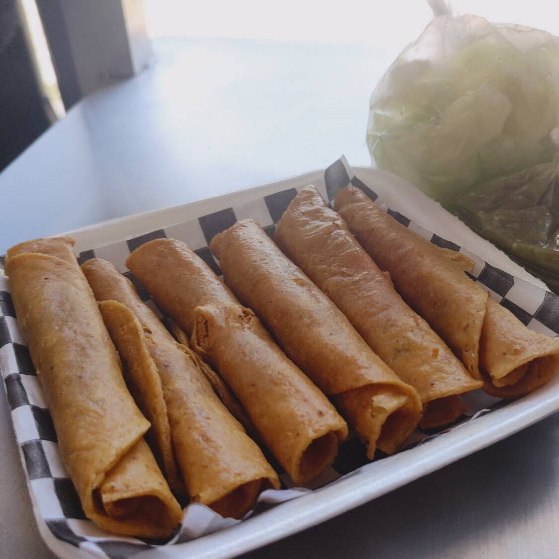Orden de 6 tacos enrollados de pollo al pastor., acompañados de lechuga, salsa verde, degustación de papas guisadas, chiles toreados