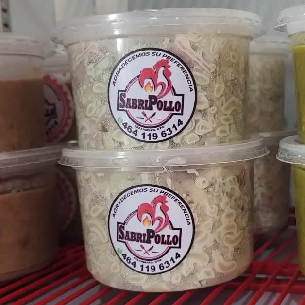 1 Pollo rostizado, 1/2 Lt de sopa de codito, 1/2 Lt de papas guisadas en salsa verde al limón, 1 orden de flautas de pollo o papá 6 pz, acompañado de salsa roja, salsa verde, chiles toreados, lechuga, tortillas