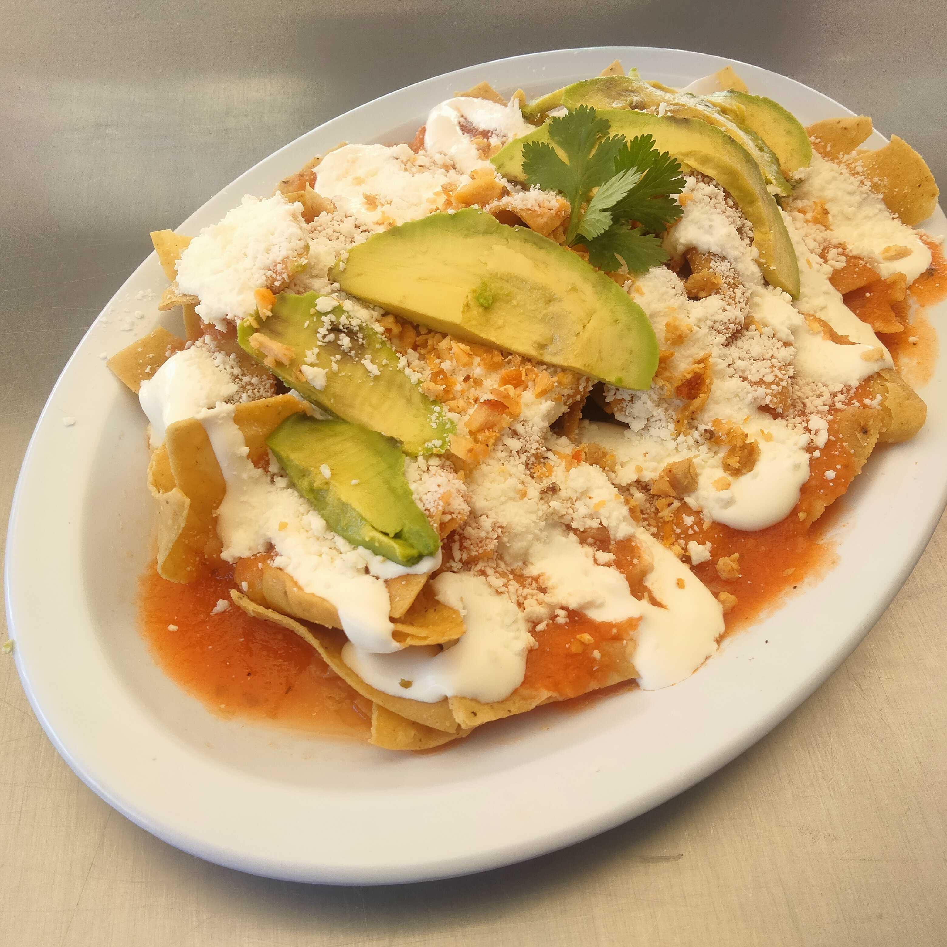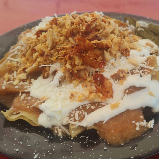 Totopos fritos, doble salsa roja de tomate, crema, queso, pollo