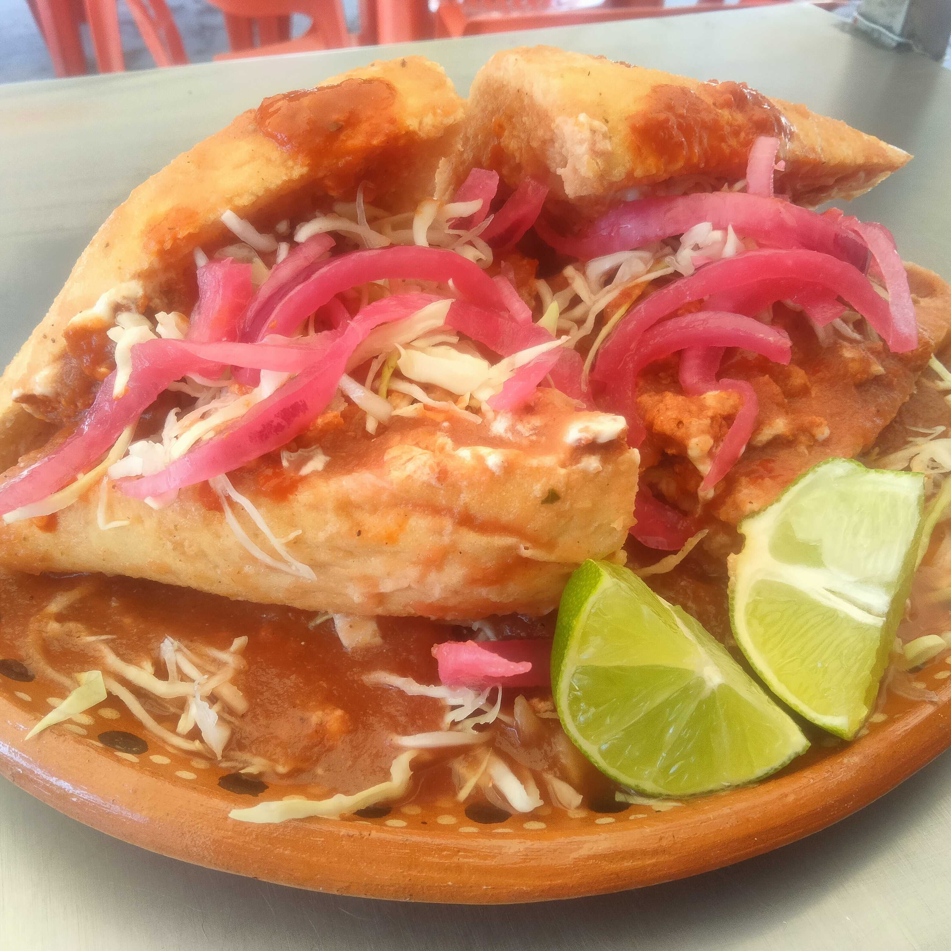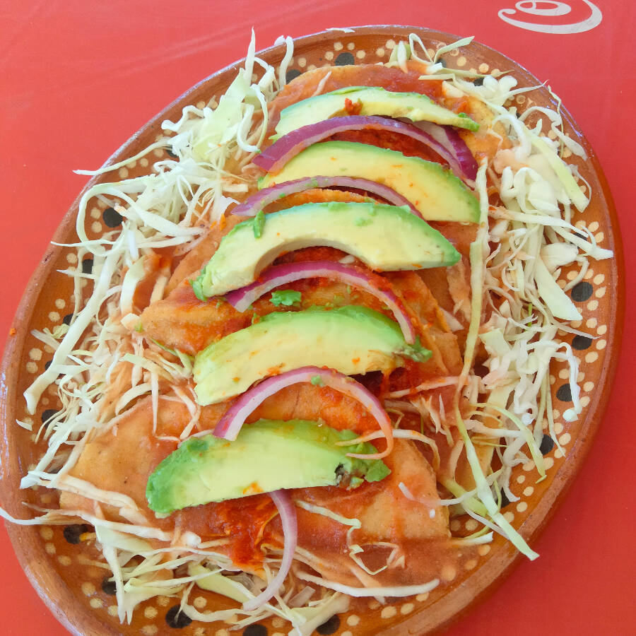 Tortilla, Salsa de tomate, crema, queso, cebolla morada, aguacate, relleno a escoger pollo, chorizo o queso, 6 pz